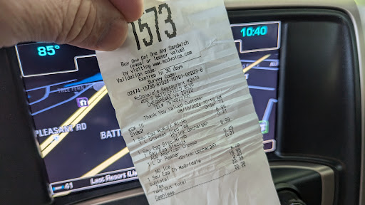 Read moreAbsolute worst McDonald's I have ever been to. I used to eat here twice a week. Never again. Their service has been on the decline for a long time now. Today, I spent 31 minutes waiting for my food, and 21 of those minutes were from the time I paid, until they brought it to me. When you walk inside, the floors are disgusting and have a slippery film all over them. Their orange juice machine hasn't worked for at least the last month and a half, so I had to get Dr Pepper, which was nothing but syrup and tasted horrible. You can't understand a word the lady at the drive thru is saying. She sounds like someone who has smoked 10 packs of cigarettes a day for the last 50 years. The laziness from the staff is unbelievable. They all drag their feet, act like it's your fault when you ask what's taking so long, and get horrible attitudes when they have to bring out your food. The owner of this place really needs to do a complete staffing overhaul. Not a single person who works inside this establishment is worth the pay that they're making. I will never go here again. Attaching a photo of my receipt that I took as the worker brought my food out. 21 minutes from the time I paid until I got my food. Completely...