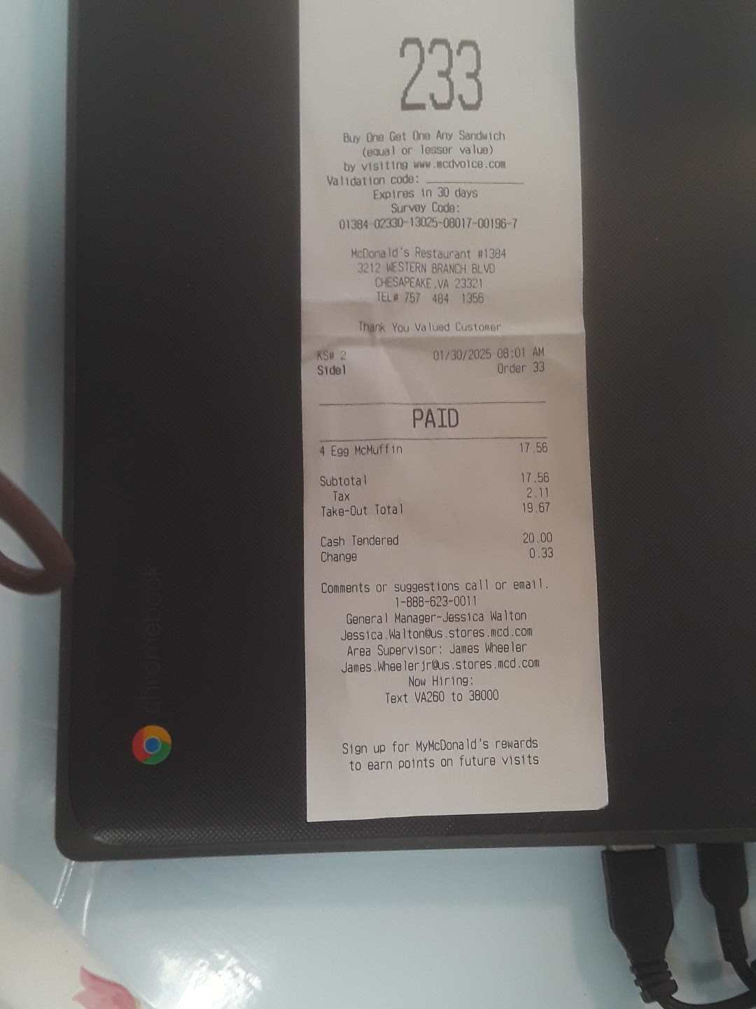 Read moreI normally go to other restaurants for breakfast when I am out at that time but today I went to McDonald's for the first time in years and went inside to to place and pick up my order for four Egg McMuffins. I waited 25 minutes and then my order was ready for me to grab off the counter. I picked up my order and check the contents of the bag and found it was not my order and the other order that was brought out at the same time for another customer was also not with that person had ordered. So while I was there McDonald's screwed up two people's orders. Finally the lady who brought the orders out came back to the front and I told her it's not what I ordered. It should be four Egg McMuffins just like the little labels stamped on the bag shows. So I waited another 20 minutes and finally I left with four Egg McMuffins and when I got home, my family and I started eating our Egg McMuffins only to find out uncomfortably there were eggshells broken up inside of her egg 1 hour Egg McMuffins. I know that the eggshell is a part of the egg but it should not be in my sandwich and it shouldn't be in everybody else's sandwich. So McDonald's cannot get the orders correctly to the person the first time and they can't keep the egg shells out of the egg on the Egg McMuffins. And the long wait and a half price for what I had to deal with McDonald's is a place that I will not be going to again 4 years and I will continue to visit other restaurants like Bojangles Burger King Hardee's and the mom and pop stores that do breakfast and seem to do it way better than McDonald's and I don't have to touch buttons on a kiosk when I can just walk up and tell somebody what I want and get fast friendly service and get the correct quality food quickly and for less money. It seems the golden arches has evolved to the point where you have to have plenty of gold in your pocket to pay for the meal and plenty of time to wait for your meal and then you have to tolerate crap that really should not be in your egg that most other places seem to have done a good job of eliminating egg shells from your food. McDonald's will not improve until until everybody stops doing business with them. When they're going out of business maybe they'll get around to their old model of doing business fast friendly and in person and giving you a quality product that doesn't contain the byproducts that it should have remained somewhere other...