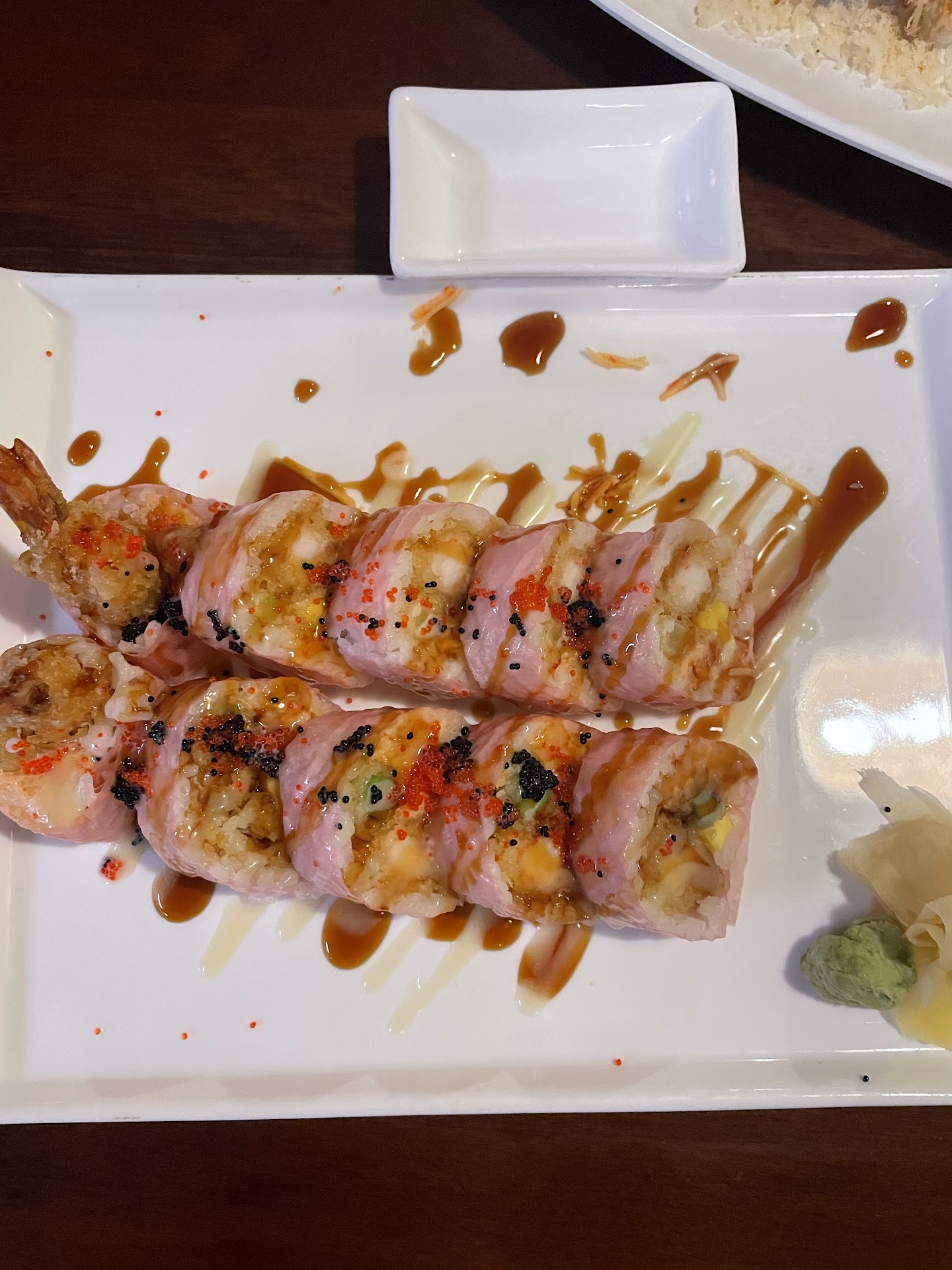 I’d say I’d give 4 stars for creativity. But the execution was so so. First time for me to see tempura shrimp with asparagus, mango and then wrapped in soy bean wrap. I had a different idea of how the soy bean wrap would look like since I am familiar with the tofu skin used in Chinese cooking, I thought it would be similar! The soy bean wrap is more pinkish and really doesn’t have a distinct taste. This sushi was called Tokyo Love. While the soy bean wrap didn’t really do much to enhance the taste, the other ingredients were fresh and good. I came here on a recommendation from a friend I met up for dinner. Service is good. The waitress seems to know my friend as repeat customer. There was only one waitress but she seemed to keep up with taking orders. The ambiance is okay, place didn’t have much lighting, not a...
