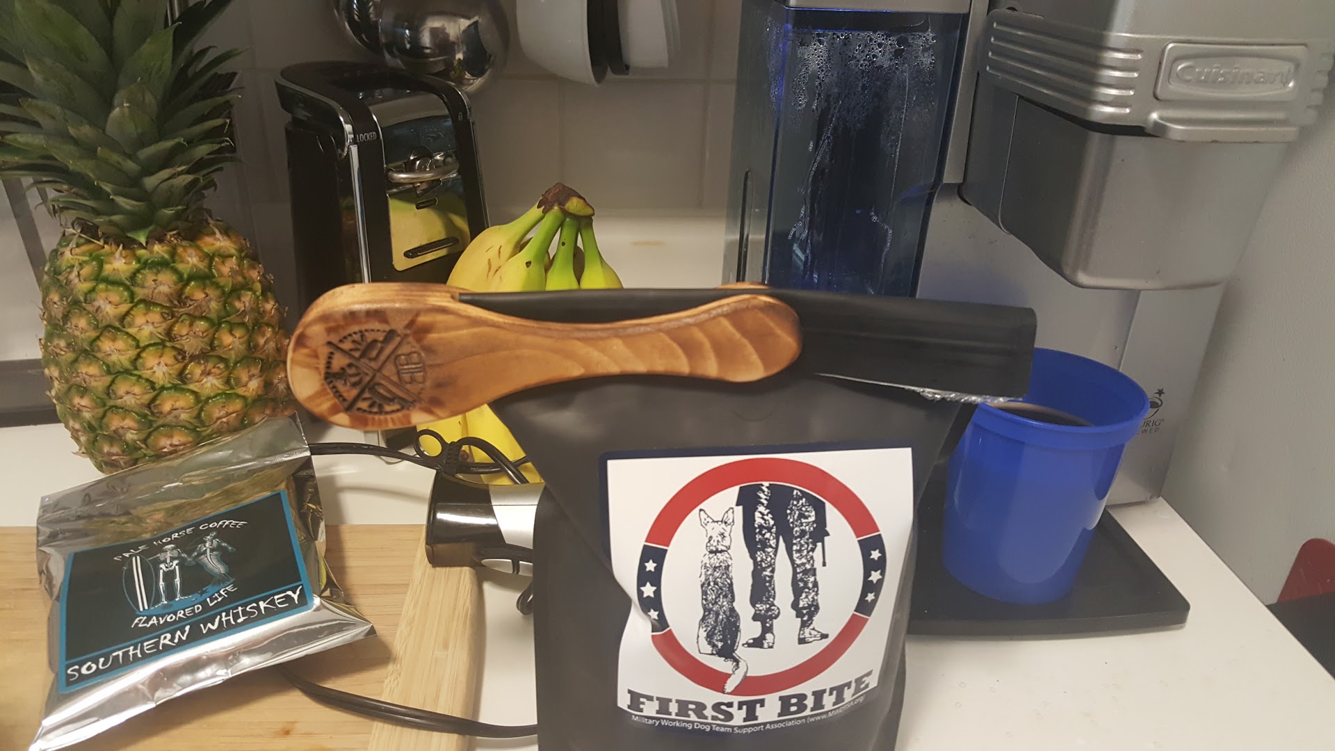 The shop has a large open concept with plenty of seating and electric outlets. Many folks were working to include adults and a couple of homeschool families. Military patches and challenge coins are displayed on walls. Bags of coffee and merchandise promoting the shop are available for purchase.