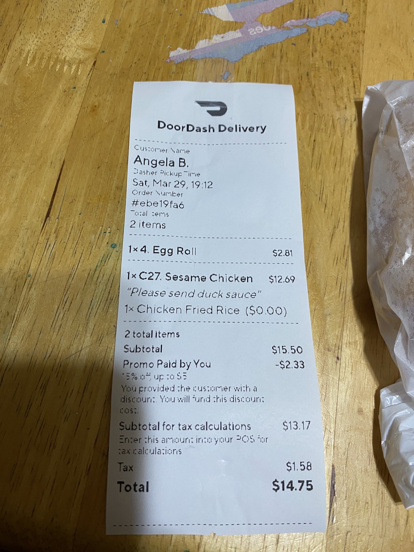 Read moreI ordered sesame chicken combo which comes with an egg roll and my boyfriend also ordered a combo too. I ordered 2 spring rolls and 4 additional egg rolls and received only 2 egg rolls. No Fortune cookies, sauces, napkins, utensils or anything. When I called.... exactly like another young lady they told me to contact door dash. Door dash doesn't make the food order, have u pay for numerous items you don't receive and they weren't the only who gave us rice that half of it was hard like it was cooked and left under a heating lamp all day. Of course when u want ur money back for at least the items u didn't receive all the English they suddenly know is "call door dash" "door dash"......wtf I hung up. Don't waste...