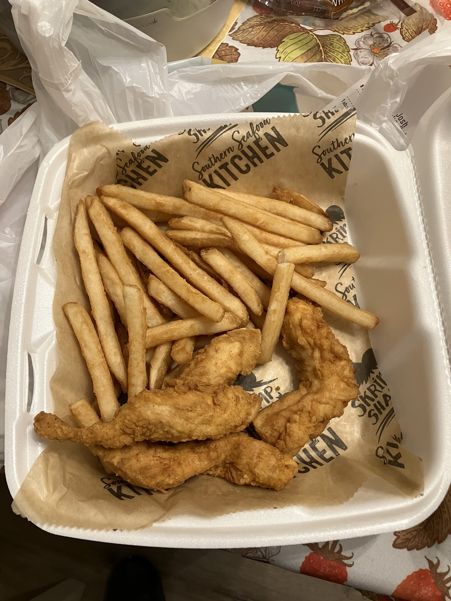 Additionally, we ordered a box of fries (it's really just a styrofoam to go tray) and the hush puppies.