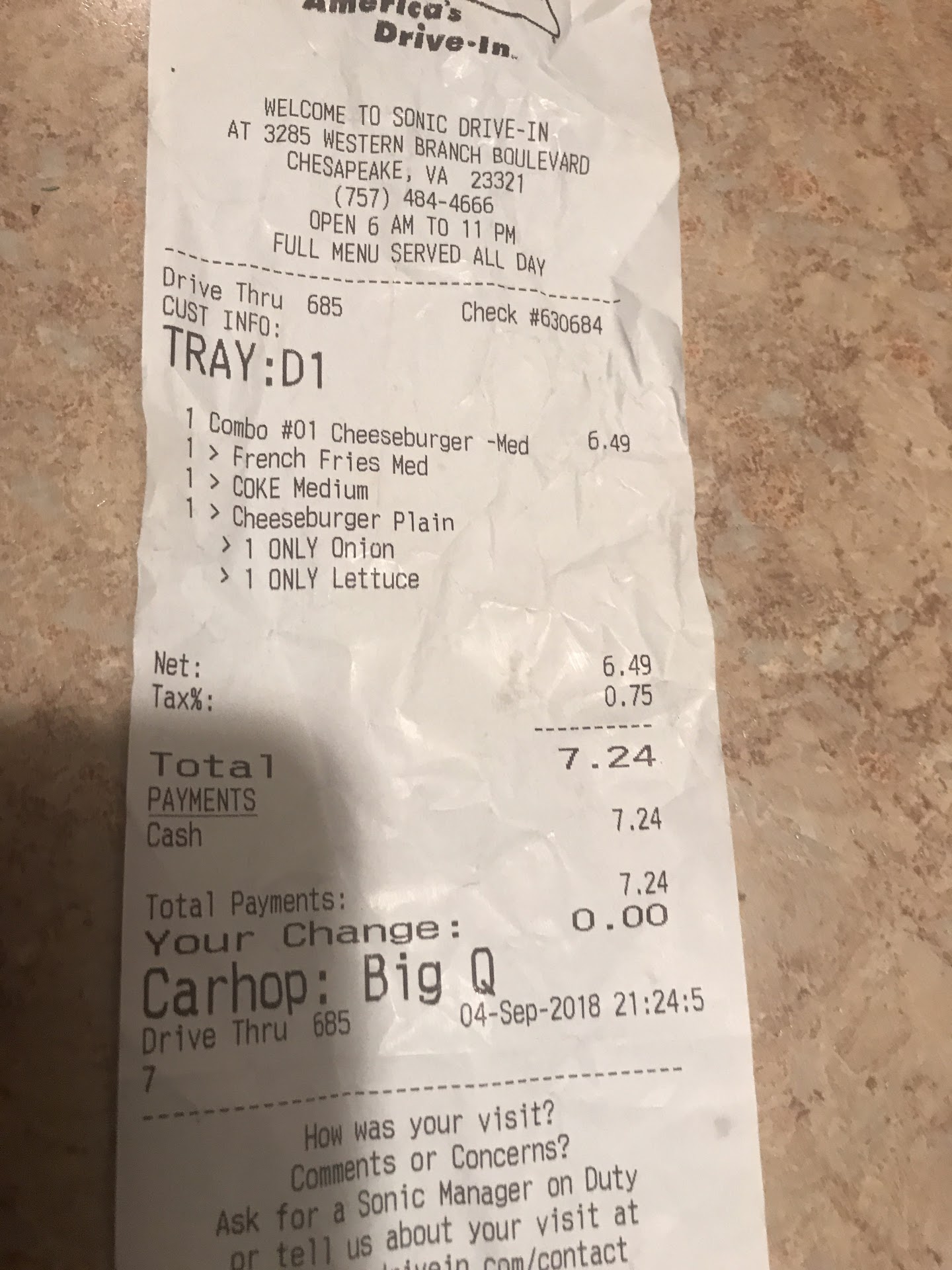 Read moreIt took way too long for my order to get to me. There were a few cars the parking lot, my family and I were the only ones on the patio. When we pressed the button, nobody inside decided to answer us. A man working carhop outside ran in to answer it. We ordered 3 cream slushies, a shake and an ice cream dish with oreo. We placed our order at 7:33pm, the person who made the order clicked it off screen at 7:41pm. We did not get the drinks until 7:52pm. Our drinks were sitting on the counter the whole time. We can see right inside the place. The only reason we even got the drinks when we did is because my husband said something to a man that came outside with nothing in his hands but sauce for a vehicle. You have a tray, that can carry more than just sauce. Bring 3 orders out at a time, remember where you're going, keep a little bit of change on you, learn to do math in your head, and put the sauce on the side. It's not that hard to do. I did it for years. The man who finally gave us our drinks was the same man who ran inside to answer us when we ordered. I think he was the manager, he was wearing all black and apologetic. I did not catch his name, but I want to thank him for trying. He was the only one I seen doing anything. I used to be a manager at Sonic, I know how the restaurant works. All I can say, is that whomever is in charge of that particular Sonic, needs to reevaluate who is running the establishment at night. Because they are going to run the restaurant...