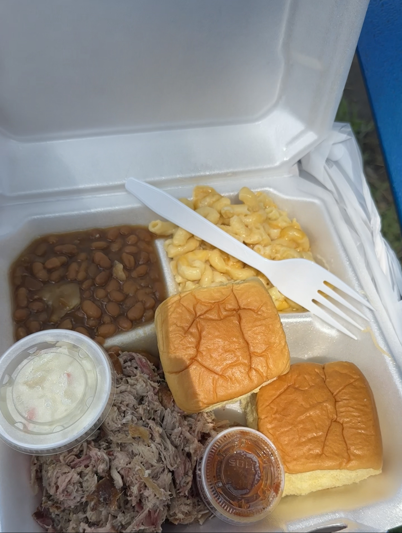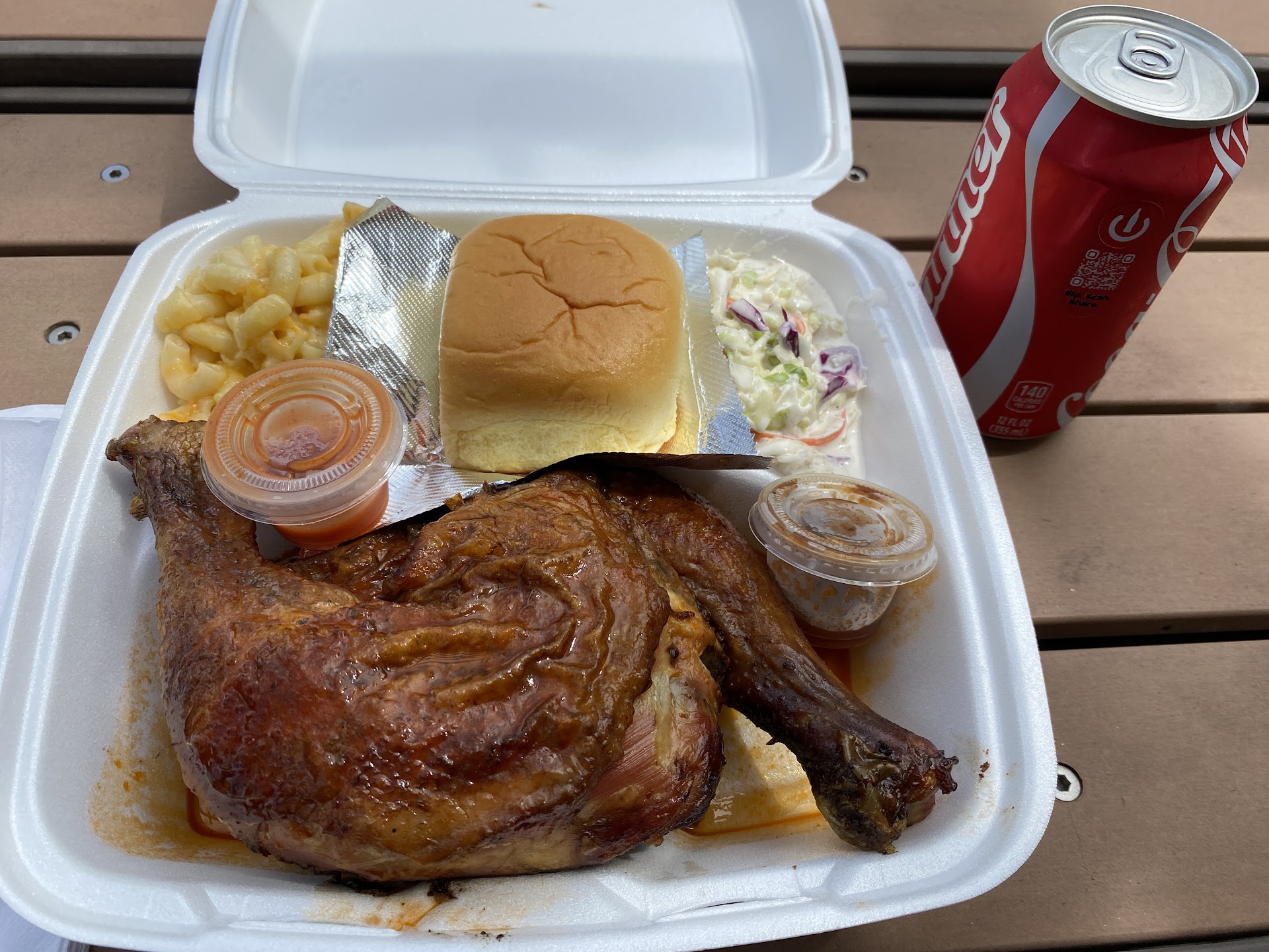 This is a lot of great food for a great price. I was working in the area over two years ago and really liked this place, I am back and stopped in for a late lunch and nothing has changed. Everybody is very friendly, the food is exceptional and the price is affordable. I got two chicken leg quarters, which comes with two sides, I got the mac & cheese and the coleslaw. It also comes with a roll, I went ahead and added a drink. The food was $10, with the drink I think I paid $12. I ordered less than two hours before they closed and the chicken was still very moist. I like their Mac-n-cheese and the Cole slaw was delicious. I had one the other day that was dry and tasteless, there’s is very moist, with a...