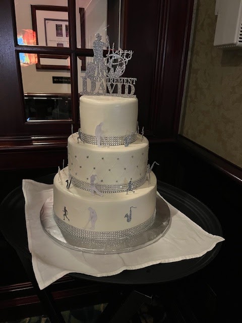 Since the cake was a retirement cake for my husband, I chose glittery silver âcupcake toppersâ as a decorative, whimsical, and personal touch. The cupcake toppers, which I purchased online, mimicked at least three areas on which he plans to spend more time. I chose male runner silhouettes, male golfer silhouettes, and saxophone silhouettes. I also purchased the cake topper online. I provided the online purchases, and âSweet Kream Bakery,â- the subject matter experts they are - did the rest!