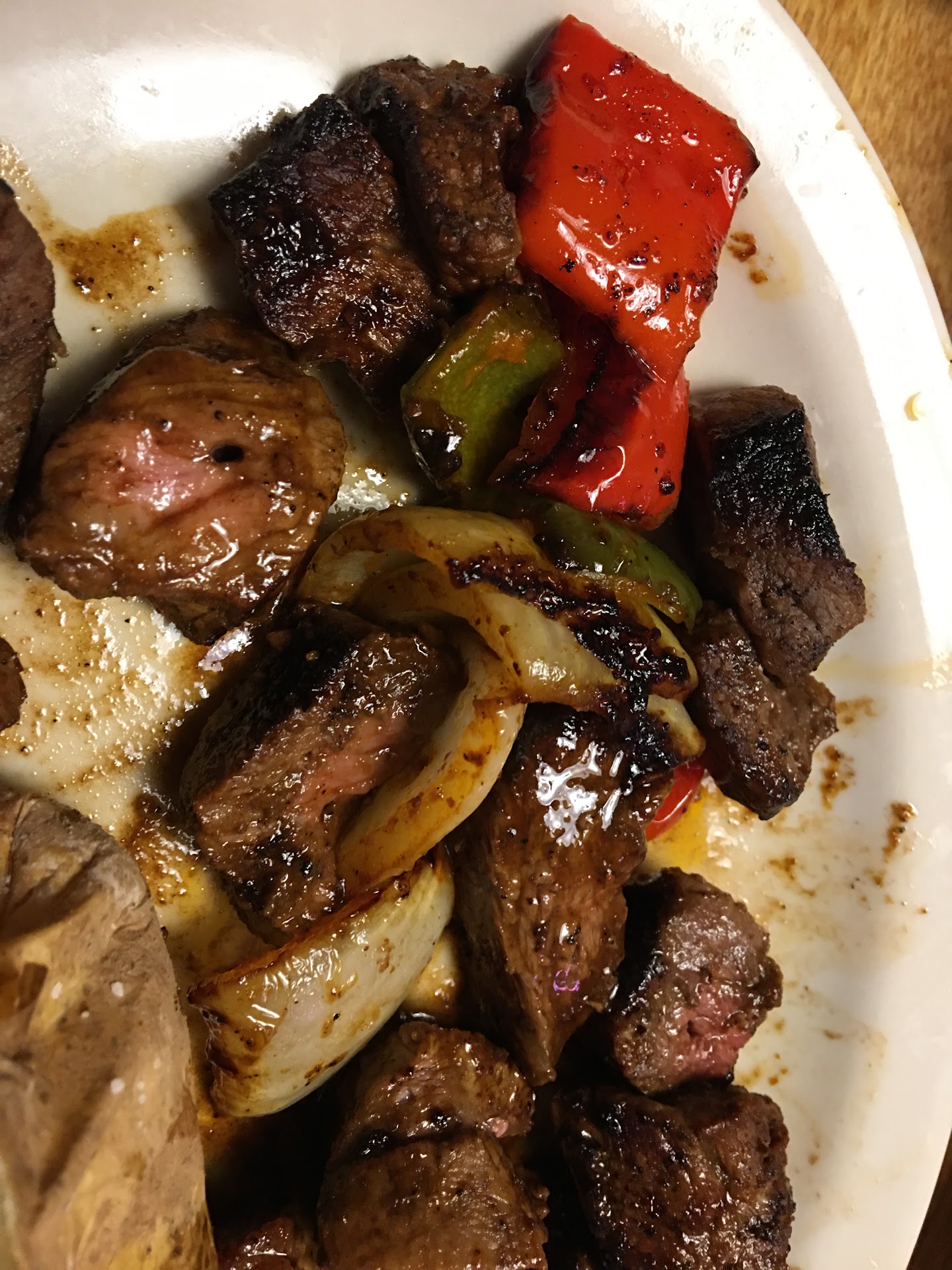 Read moreAlways enjoy TR but today wasn’t our day! Seated w in 15 min w rolls-no butter (had req regular). Tea was brought to table promptly but no straws, no small plates for rolls, no napkins, no silverware. We req from waitress-received ea (individually) over 10-15 mins. Rolls were cold so brought more. Placed order-Bloomin Onion, ribs and kabob-med rare. Salads brought to table first-NO appetizer yet (onion)?? We asked waitress to check-never arrived. Finally she came back-said “onion wasn’t ready bc only one fry cook but food was ready to bring out. Did we still want onion”? “Yes but w no charge”. Worst onion ever! Overcooked and unable to even separate to eat. Wasted! Our meals arrived. As you can see in pic, my med rare kabob was burnt (pic does not do it justice). At least half I could not stick a fork in. Baked potato was soft only in center. Never did get sour cream. We asked for manager who first said “they just left the kabob on too long” as if eat it anyway. No. “Then do you want us to re-do?” “No bc husband almost finished eating his ribs by now.” Manager again acted as if I should eat it-clearly no way. He said he’d adjust ticket. When ticket arrived, the kabob was “half price”. We req to see manager again and he said “you told me you were going to eat it”. NO I DID NOT! Said he “must’ve misunderstood”. Again told him I ate 4 bites-I didn’t come to eat burnt steak! Said he’d “talk w cook bc not first complaint he’d gotten re kabobs”. We were never ugly-tho told him this was worst visit ever. The kabob was credited on next ticket. I had asked for tea refill while all this was going on. Waitress slammed it on table and kept walking. Husband went to restroom-floor was slick w grease around BR/dirty dish area. We had mentioned when we went in that floors were nasty-spilt butter in floor at roll area, walkways to table scattered w food and litter. Sorry to say it’ll be a long time...