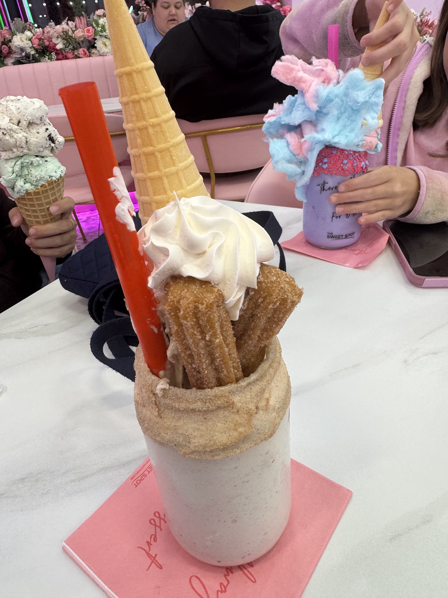 Take their churro shake, for example. It comes topped with fresh cinnamon-sugar churros, a swirl of whipped cream, a full-size upside-down cone, and even a giant red candy stickâall packed into a cinnamon-sugar-rimmed jar. Itâs a full dessert course, not just a drink.