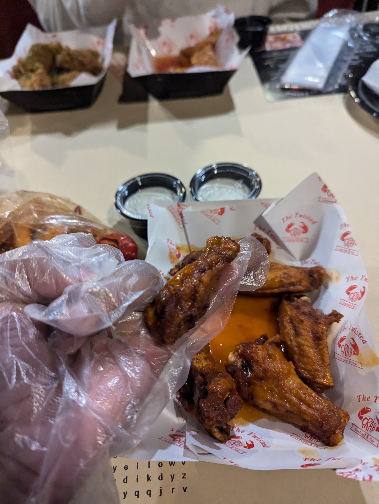 Read moreIt was my first time dining at this specific location and I overall enjoyed the experience. When we walked in we were greeted so well but a staff member there and was immediately seated. It was great because there was no wait time at all! Our server then came to the table and we quickly ordered our drinks. She was very prompt and polite the entire visit, and definitely checked upon us constantly. It was a nice and chill atmosphere as well! Previously, I had not known that they had happy hour! So I was definitely excited to see the deals that they had and I thought that they were very reasonable for the amount of food given. So if you haven't already, check out the happy hour! You will not be disappointed! I ordered a boil bag with a half a pound of crawfish and half a pound of shrimp, that also came with a potato and corn. Additionally, I ordered the Buffalo wings. The boil bag was good and I definitely enjoyed it! My only concern with the wings is that some were really small, so I had to alert the server so that she would bring me out more. As you can see in the picture, that Wing was so little, that it could sit on my pinky. And I have a really small pinky finger. After she came and looked at it, she definitely took the plate back and replaced it. The wings were slightly bigger, But overall I was satisfied. So beware that those wings are small and don't expect anything different. I'd still recommend trying this place out because the food is good and the...