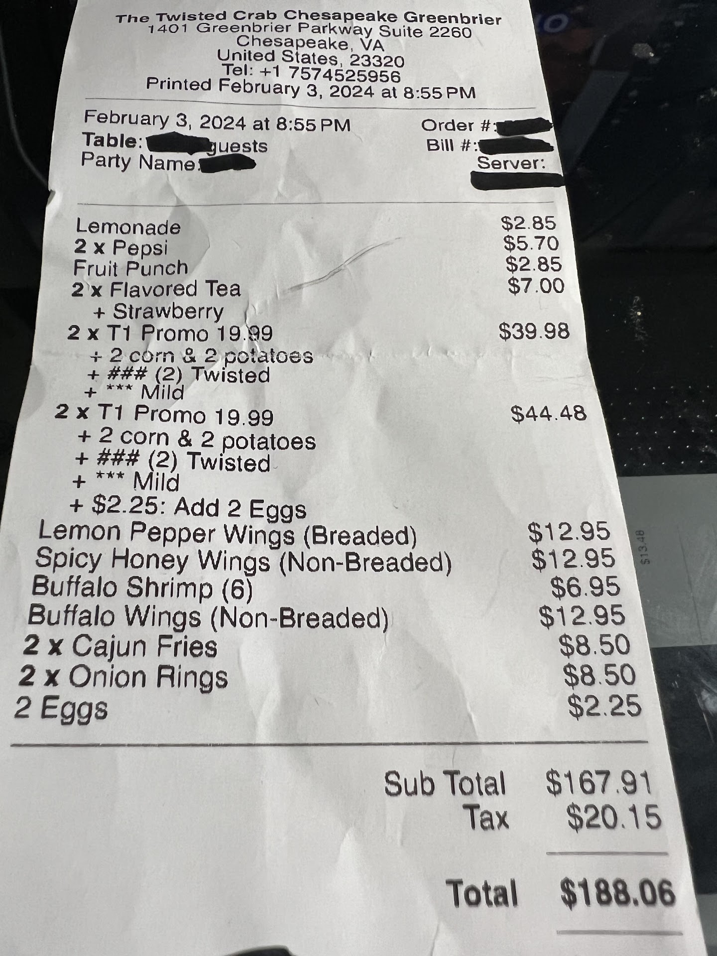 Read moreWent to the Chesapeake location last night. The restaurant was alright. Getting to the point.......the food was way to salty. I was expecting to taste seafood but it was too salty for my taste. Ay first I thought it was just me, but a little while later, my wife had said the same thing that I was thinking. For $25, I had a bag full of sausages, 2 potatoes, some shrimp, a half of crab and 1 corn. When we were trying to get our drinks refilled, the waitress took our cups and disappeared for about 15 minutes leaving us to eat this salty food with no drink to wash it down. When we gave the waitress the money to pay for the food, she disappeared for another 20 minutes, leaving me to go find out were she was at. Come to find out she on the other end of the restaurant tending to other people. I had to walk up to her while she was doing her job and ask her for my money so I can leave. Not the worst dining experience yet, but defo wnt be coming back here with prices and service like this. For those prices I'll be going back to my old stomping grounds where the food is plentiful, tasty, a lil bit more expensive, but very delicious and plentiful............CAPTAIN GEORGE'S...... .YOU NEVER GO WRONG HERE!!!! Thank you, Twisted Crab, for showing me the error in my ways and and to never go...