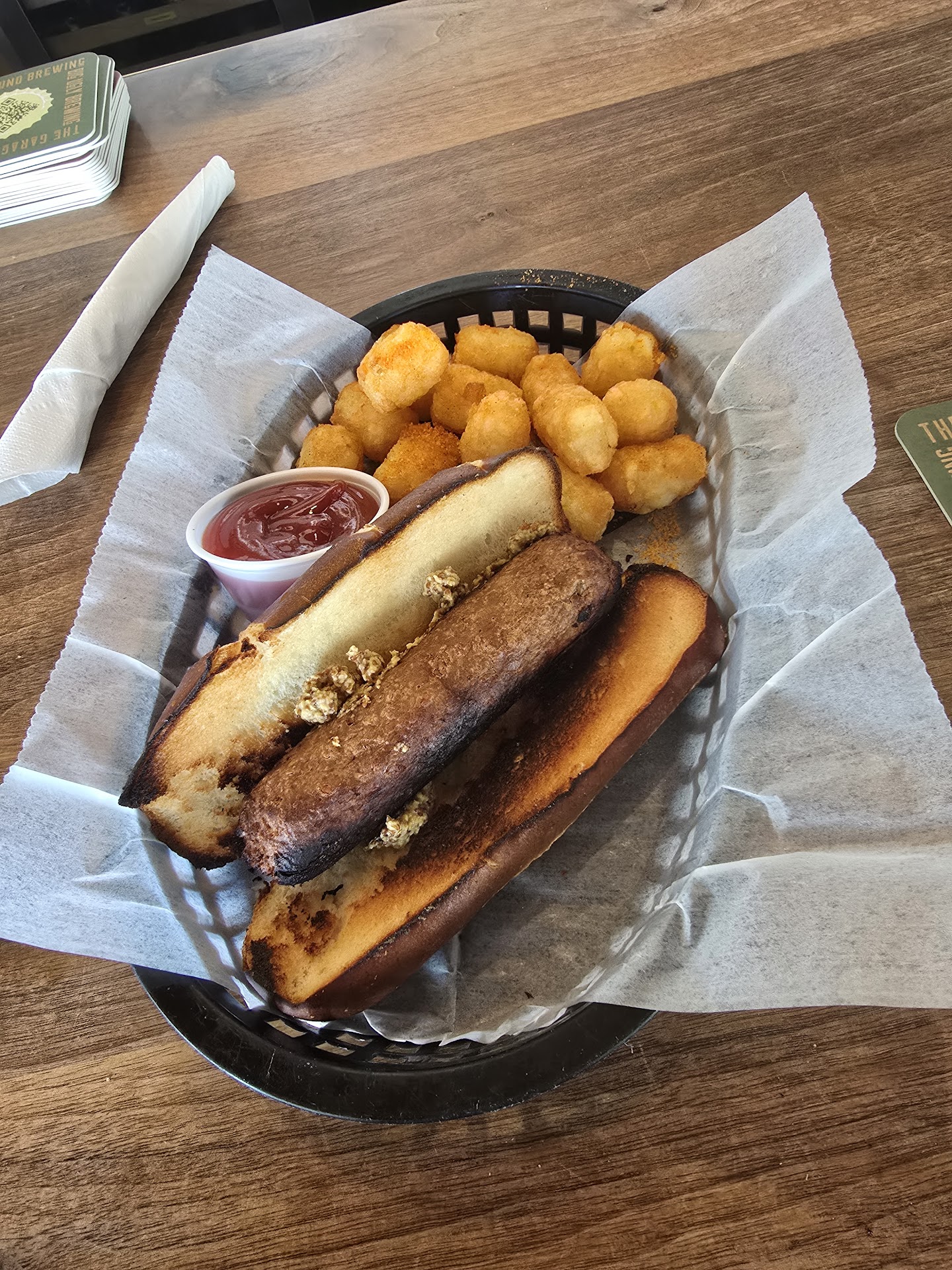 Read moreI went there for lunch because i was over in the area. I got the dog bones. They were really good, but it did take 4 napkins to soak up the grease. Then I tried the vegan brat. It wasn't terrible, but was very dry, and the bun was a little over toasted. Bartender recommended the tots...spot on, they were probably some of the besr I have ever had, but the portions....so small. I had the stout. It was pretty good.