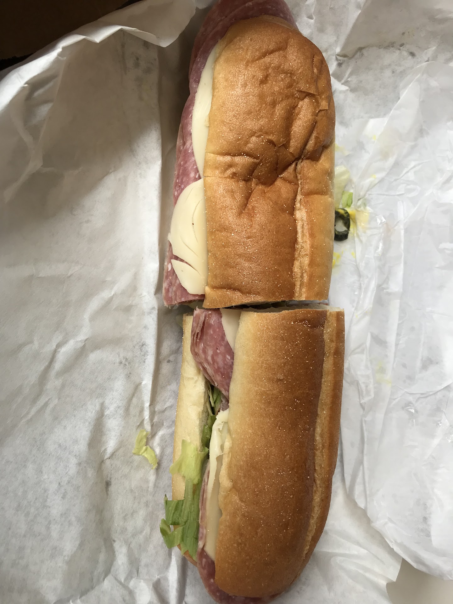 Read moreCan't believe I have never been to this deli; I've been missing out. I was extremely pleased with my order. I had a full grinder with salami, provolone, lettuce, tomato, pickles, olives, mayo, oil and vinegar (pictured). Everything was fresh and they put a generous helping of meat, cheese, and toppings. The pickles were a little tangy (I'm very particular about pickles. I enjoyed them, but I don't know if everyone will).