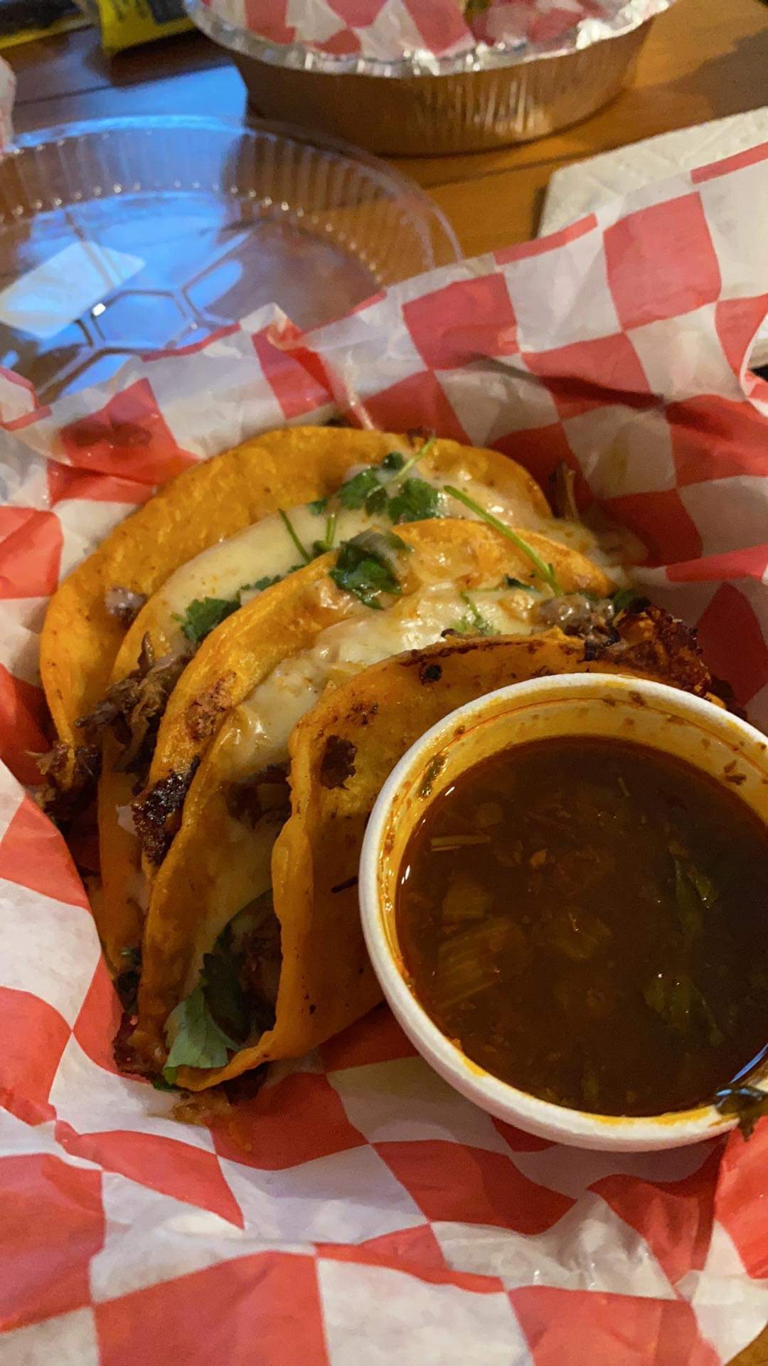 Only had to wait a few minutes for the order and when we got it home, we were totally pleased and satisfied. The meat was tender and juicy and flavorful, with gooey cheese and tart onion and cilantro, the tacos were crunchy and the consommé was hot and rich. Birria excellence!
