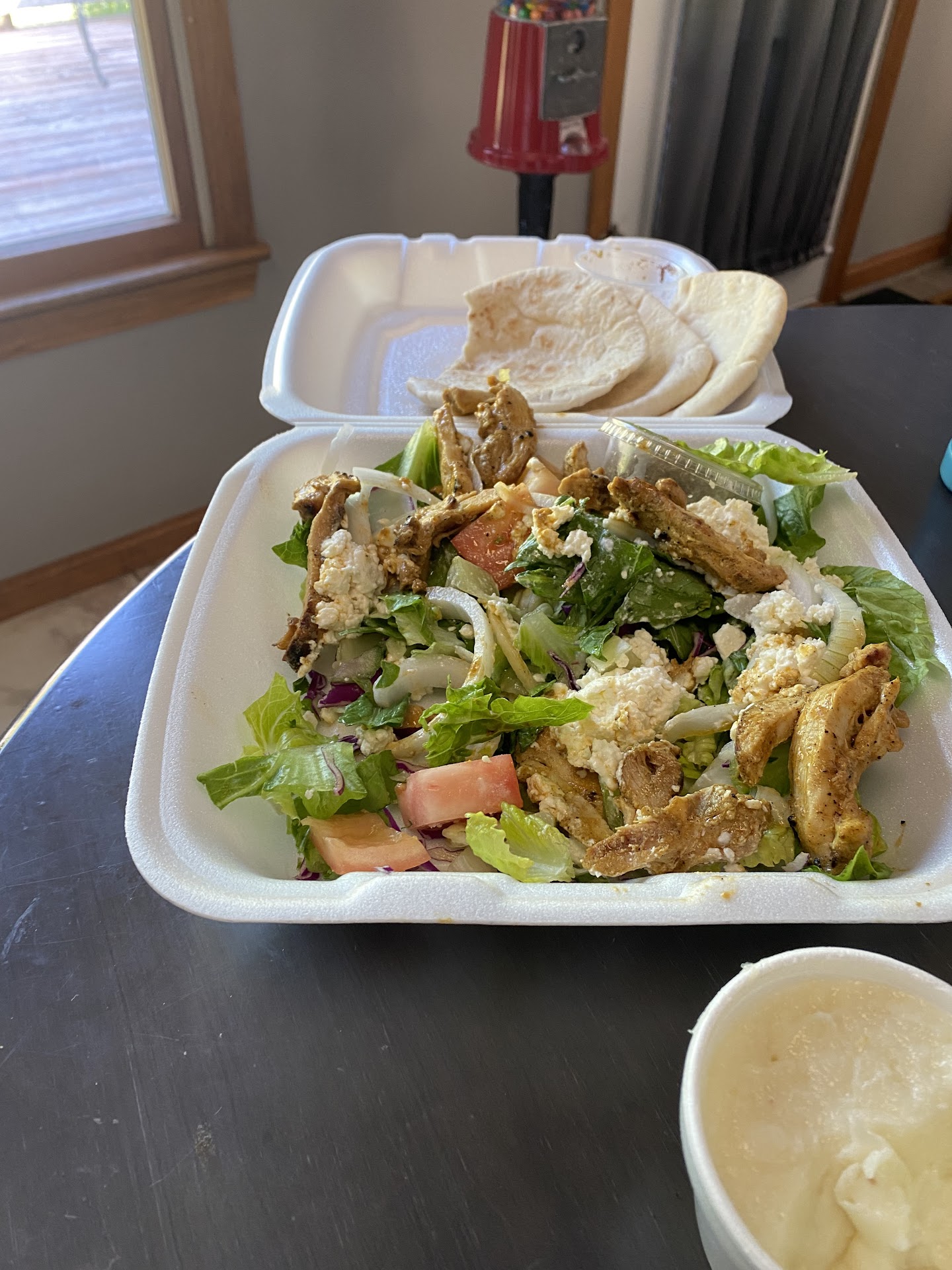 Today, I actually ordered garlic, hummus and my usual Lebanese salad today with feta. I made the mistake of getting chicken schwarma. The hummus was fine. However, the bread they gave us was not fresh. It had that previously warmed feel to it, like it was extra served to someone who didn’t eat it. Hard and stale.