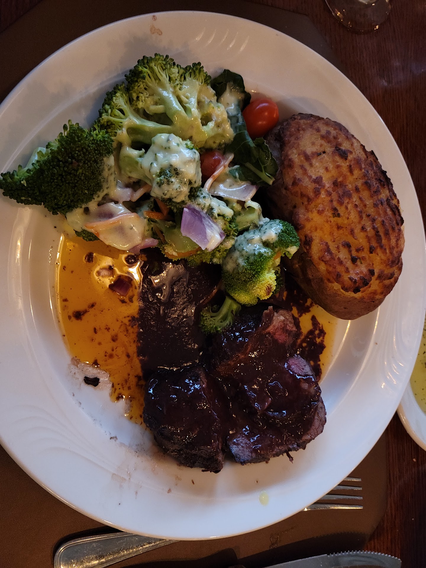 I ordered the 12oz dry aged ribeye, medium-rare, my wife ordered the 7oz wet aged filet mignon, medium. We ordered au gratin potatoes to share.