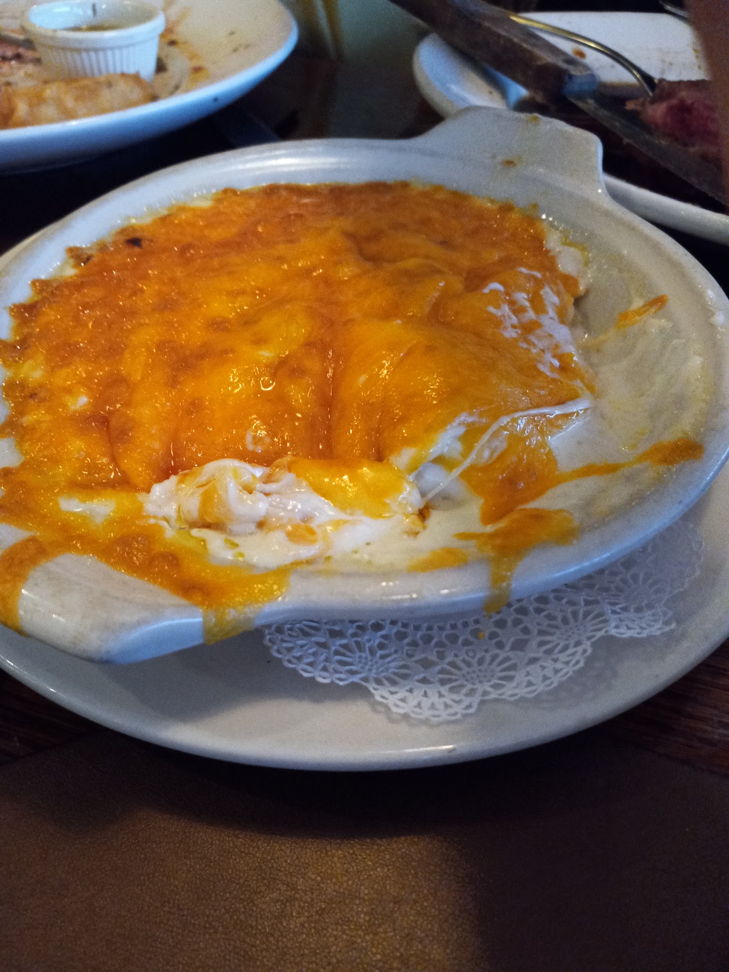 By the time we did get our food, it was all lukewarm. Nothing was served hot. We figured the food was sitting for a moment or two, because the Au gratin potatoes had all the signs that at one point, the cheese was bubbling hot. However, by the time they had gotten it out to us, the cheese skin on the top of the dish was thick and congealed, covering lukewarm potatoes in a cream sauce. We both took one bit and decided to pass.