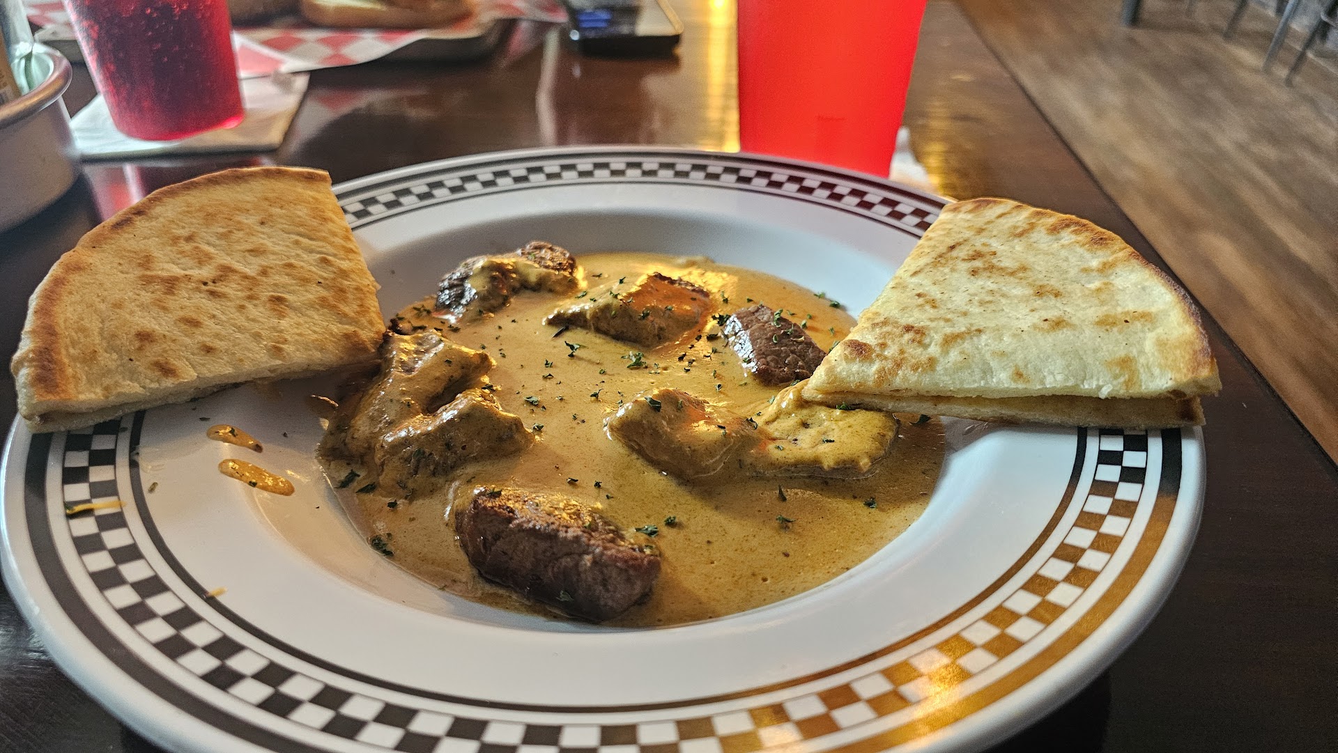 Stopped in for lunch one day with my grandfather. I had the corned beef sandwich. We sat at the bar, servers were super nice and friendly. Food was pretty good. Their meals are served on a "cutting board" hence the name. The atmosphere was nice. We liked that it was a quieter place where we could actually chat and enjoy our meal. It wasn't loud at all.