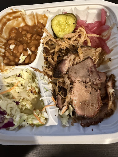 We were driving by and seen the sign so we decided to try. They are only open on Fridays at this time so it was a happy accident. My husband and I ordered the platter pit master to split. It was a good portion of food. Chicken wings- great smoke flavor and tender, got them naked with sauce on the side. Ribs- great smoke ring and flavor, tender cooked wonderful. Brisket- fall apart tender great smoke flavor. Pulled pork- a little dry and lacked seasoning. Mac and cheese- nothing to write home about flavor wise. Corn bread- taste was great but very crumbling. Pit beans- awesome flavor definitely worth trying. All in all service was fantastic and food was good and we will be back and hopefully see them on the food...