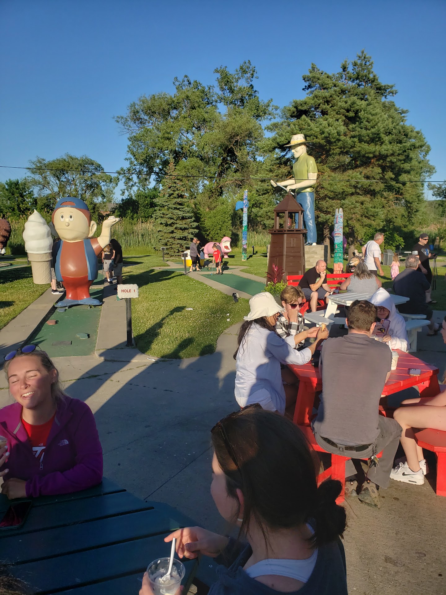 Read moreSo, the extended family and I (about 12 of us total) were looking for a thing to do that was both multigenerational and inexpensive. Someone suggested mini golf and the custard place was closest... in New Baltimore. Little did I know that i would get to experience the "worlds finest" custard while I was there. Now, don't get me wrong, it was decent custard but i think the choice of name may be a marketing scheme to get people as customers. Apparently, this type of over-zealous marketing works because there were a steady number of people in line throughout the entire time we were there (which was about two hours). Anyway, the reason for the three stars has more to do with the substandard mini-golf. The 18 hole course had lots of decorative elements to it but most of them were in disrepair including about half of the statues that look like they haven't been painted for a few years, others that had large holes in them, and two (a giraffe and a totem pole) that were entirely knocked over. The difficulty of the course was about 3/5 stars as well but it was aided in its difficulty by the amount of debris that covered each hole. I would suggest that it be someones job to arrive an hour early and blow each hole before the custard place opens. Well, anyway, we had a nice time and will probably come again someday unless we have an option that makes sense for us...