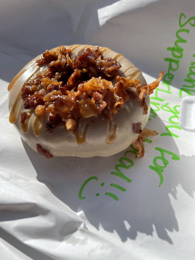 When they are cool enough, they are glazed and topped. I got Bacon in the Sun, which is maple glaze, topped with real bacon and a caramel drizzle.