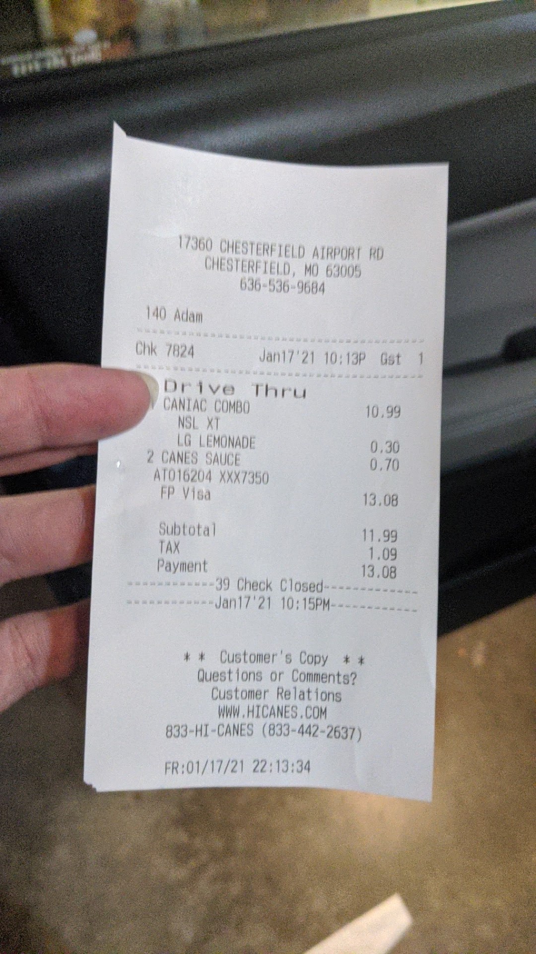 I love Cane's but this location is pretty terrible. Probably 3/5 times they screw something up. I generally just leave the review on their customer satisfaction survey but they didn't give me the right receipt this time with the survey code so I'm leaving a review here this time.
