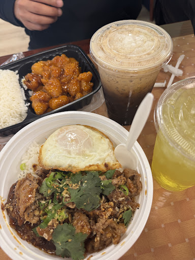 The food itself was "Del-Yicious" (to quote my grandmother). I got the Pork and Egg fried rice combo with a Thai Ice tea. SUPER flavorful marinated pork with herbs and spices that really brighten up everything in the dish. This is one of the most fresh-tasting meals I've had out in a while. The Thai tea is a delicious treat for anyone who's looking for something sweet and creamy too!