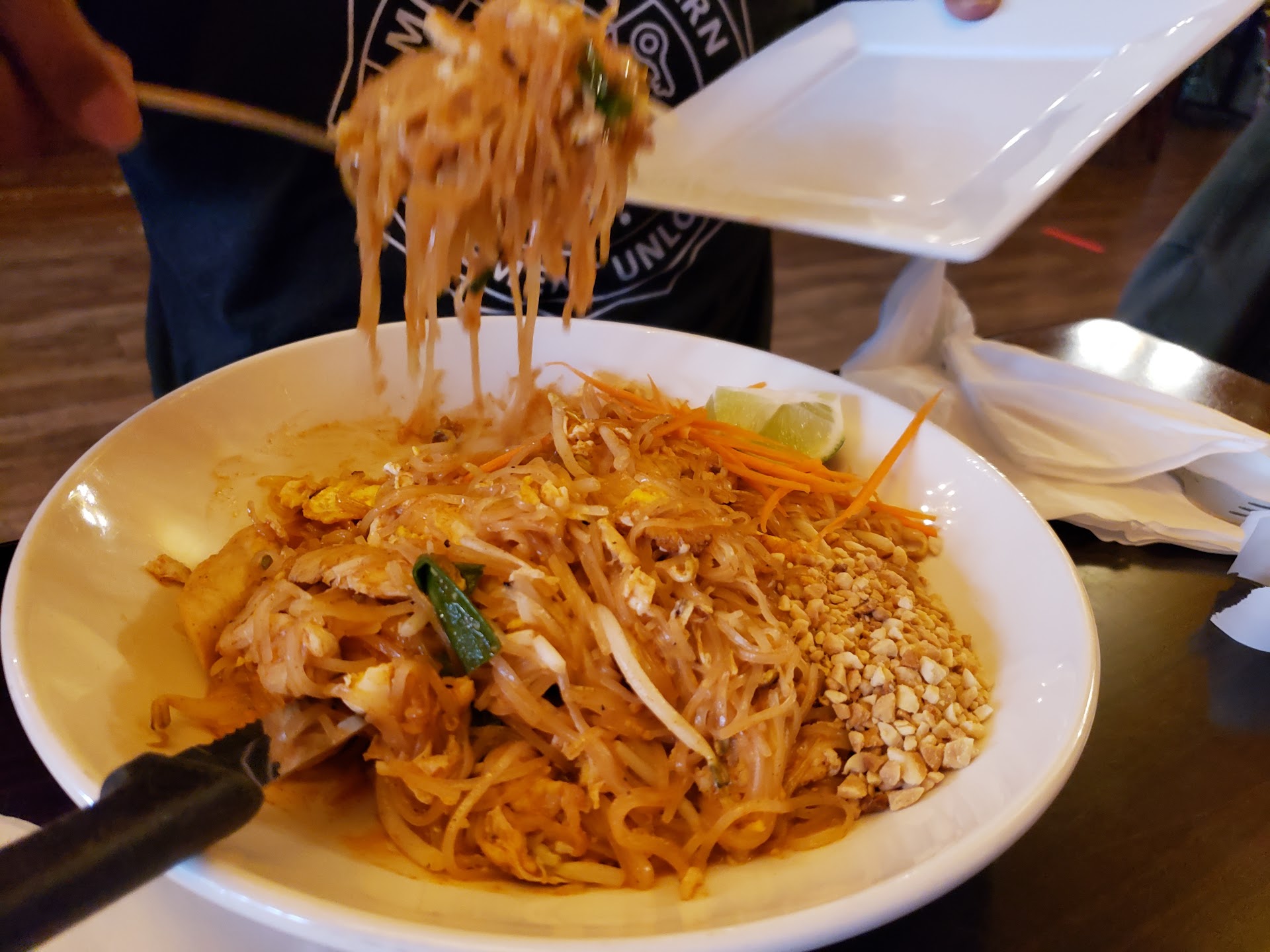 We usually order the same two dishes any Thai place we go. Pad thai and massaman curry. The pad thai was good but it wasn't anything to write home about. The helpings were very generous and so good. Despite having only one server we actually were given our food fairly quickly.