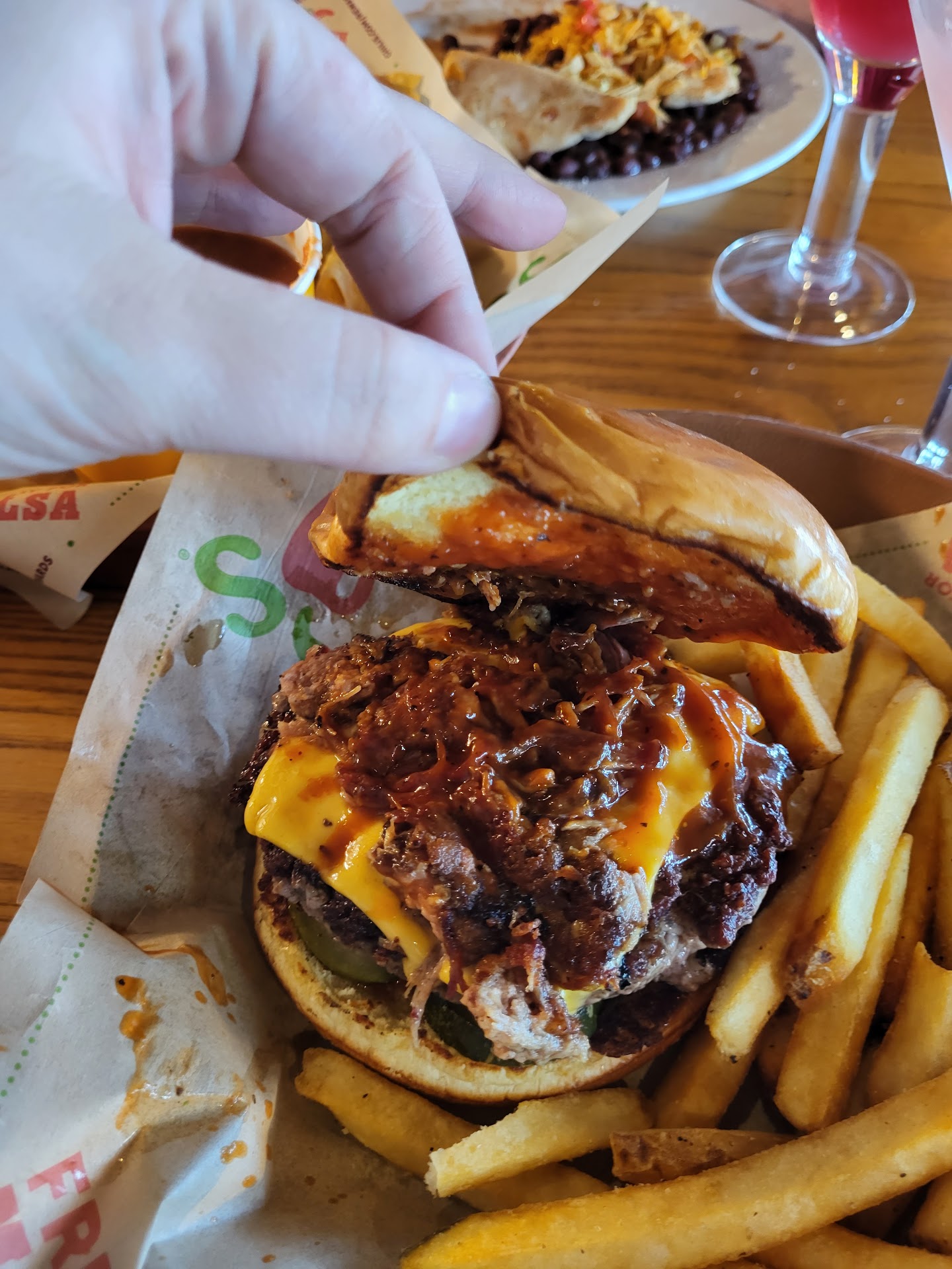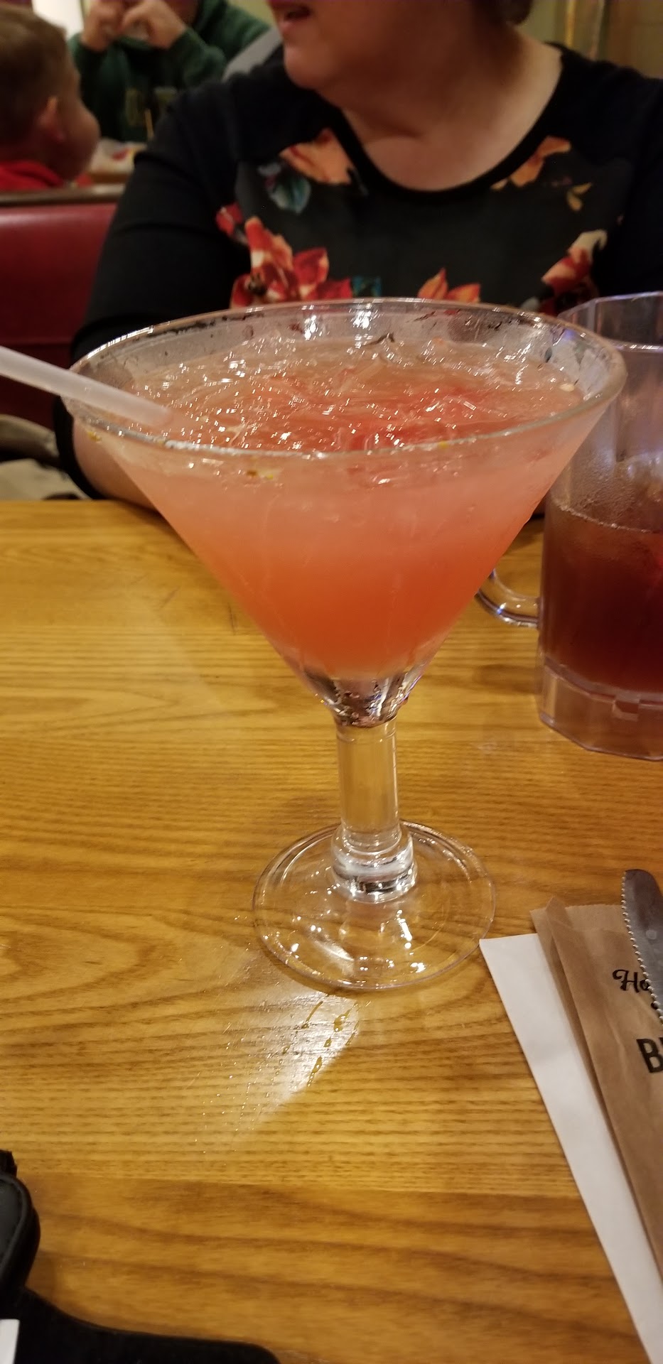 We decided to celebrate Father's Day early since me and my husband and I are both working doubles at our job this weekend. We went to have a nice family dinner at Chili's. We hadn't been to this location in a while. Usually, we go to laramie. We walked through the doors and were greeted by a young man who was the hostess. He grabbed our menus and said this way, then quickly looked back at the computer on where to take us. We got seated and were not quite sure what we wanted to order, so we got our drinks and chips and salsa. We were looking forward to a smokehouse combo with brisket only to discover that they don't have that anymore . I chose a brisket burger, which was a brisket burger that had barbecue sauce , cheese , pickles ,and slaw and, of course, came with fries. My husband got the margarita chicken. My kids got their meals fast, which was nice. Ours came out shortly after my burger smelt good . I was a little sad there was only a small amount of brisket on top of my burger patty. There was no coslaw. I asked the server, and she went and got some. My husband chicken was dry and flavorless. Our server never asked us if we wanted another margarita. She came to refill our water. My 2 kids enjoyed their kids' meal , I couldn't eat the rest of my burger and I sat it down my husband made a face at me and I said what's wrong he said your burger is still really pink on that side of the patty I looked at it and it was very pink/ raw. The service was okay , a booth in front of us had an older couple, and we watched an employee go over to their table and start shoving food in her mouth from their plates. Then she sat stood by their booth and talked to them for a little bit while still shoveling food in her mouth. Im sure she knew them, but it was a lot to watch, and unfortunately, it's not like I could look away as it was right in front of me. I think we will continue to go to laramie...