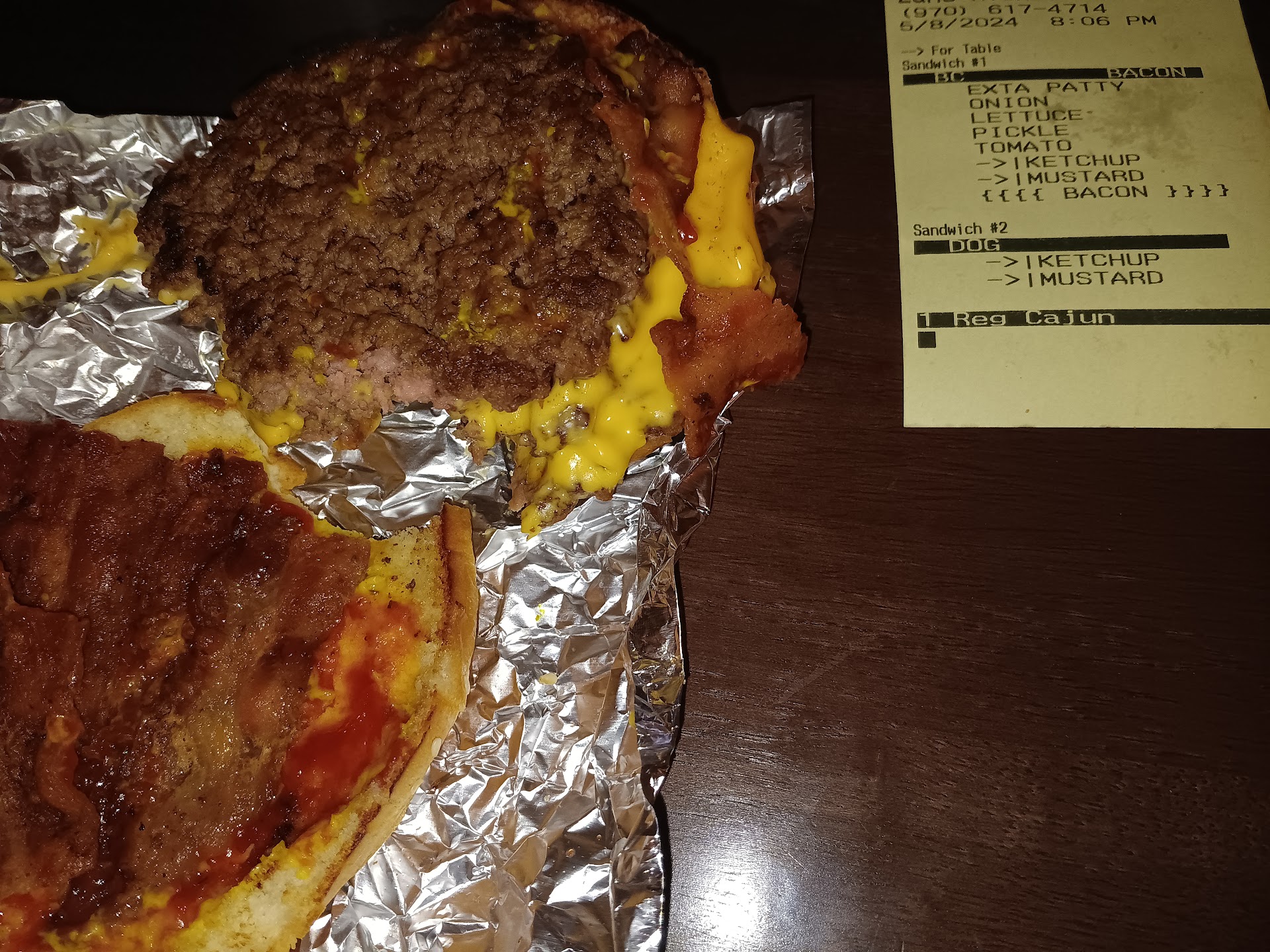 It's been many years since I've eaten at Five Guys and I deliver for them all the time and it always looks good so I figured I would try some. I got a bacon cheeseburger, a hotdog and some cajun fries. The fries are really good, great texture and they were fresh. The hotdog is also very good, crispy butterfly cut with mustard and ketchup. The burger however is another story. While it is very juicey and decent tasting, it didn't have any of the toppings I asked for except for the mustard, ketchup and bacon. I got an extra patty which I thought would make it 2 but I guess there's already 2 so it made it 3.