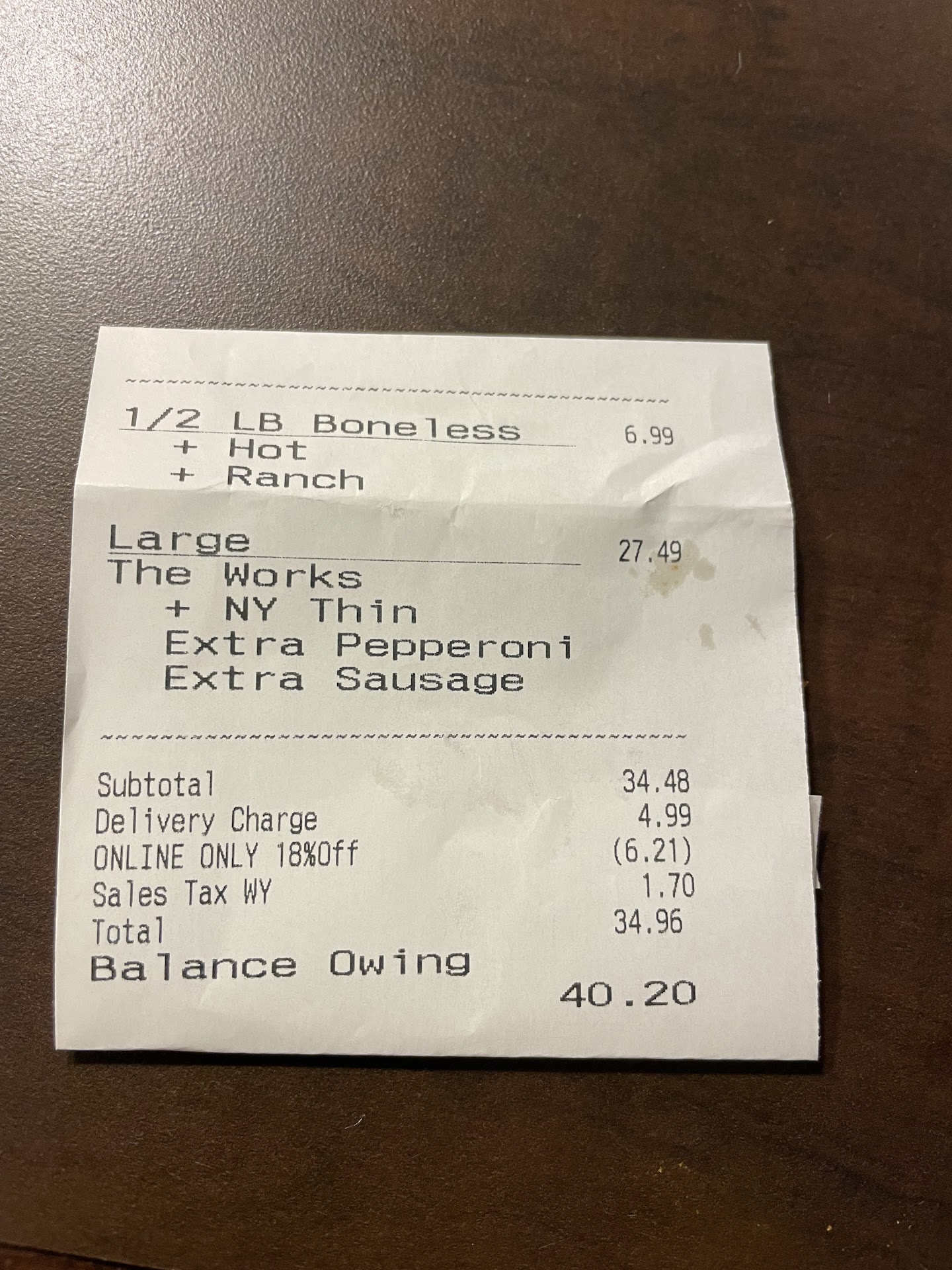 We got a half pound of rib tips with hot bbq, 1 pound of boneless wings with mile high burner sauce, 10 hot wings and a large hand tossed Carnivore pizza. Everything was awesome!