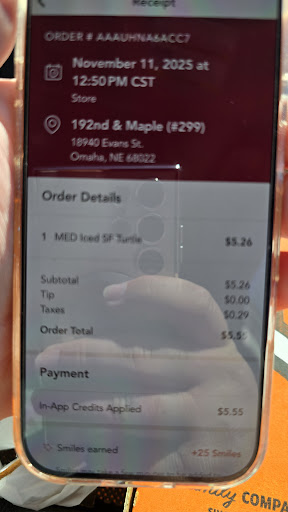 Ordered a medium iced SF Turtle for veterans day (supposed to be free) The lady at the window took 15 seconds to turn around to acknowledge us (she was talking to her co-worker) told her Im a veteran and showed her my ID. She said okay. Went back to talking to her co-worker 30 seconds later. She said, okay thats 5.55 and turns back around and talks some more My wife told me to just pay, so I put her phone out (with the app) for the blonde lady to scan it. Took her 25 seconds to turn around.