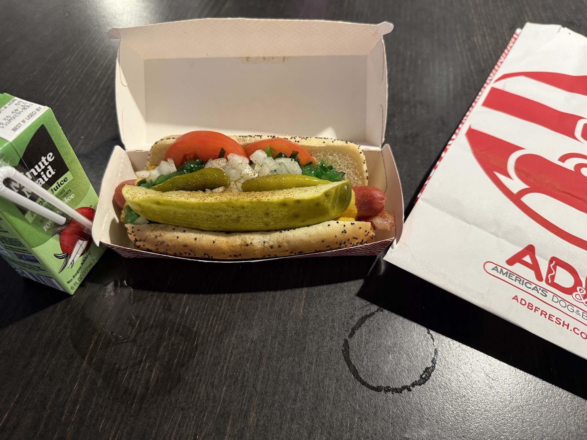 Wow wow wow... I'm truly amazed. Words can not even describe the experience I just had. It was recently glizzy Wednesday in Chi town, and it being such I decided I'd treat myself to a sumptuous meat log. That's when "it" happened, I tasted the most delicious weiner dog I've ever had in my life. I now classify my years as BG and AG (Before Glizzy & After Glizzy). Words don't do justice the weiner I had in my mouth from American dog and burger. HOWEVER... Although this was without a shadow of a doubt the most pallete enriching supplement I've ever consumed, I want to talk customer service Fo' real. The human Bean, "Matthew" by name tag "Thompson" he claimed his surname was. I mean truly spectacular customer service, it's always nice when abroad to hear another glimmer of Irish in the voice of another male and that's what I heard from young Matthew ("Bean"). He charmed me and fellow other customers with his witty type banter and good looks. He has the candour of a man who has previously worked in a supermarket type of environment but the sense of a man who has been hardened through life by failing to secure 3rd level education jobs say in an office or such but also the hustle and bustle of a man who grew up tough in the streets of a non gated community in a suburb of a large city. Moving on I was so impressed by the customer service this young gentleman provided and I formally demand that he be made managing director of the fine dining establishment that is American...