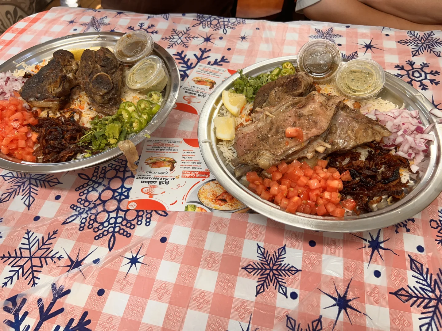 I went with my husband & kids, we ordered the lamb mandi+haneeth and the chicken mandi. They brought us out two bowls of soup, it had vegetables, and the broth was definitely made with the lamb or chicken.