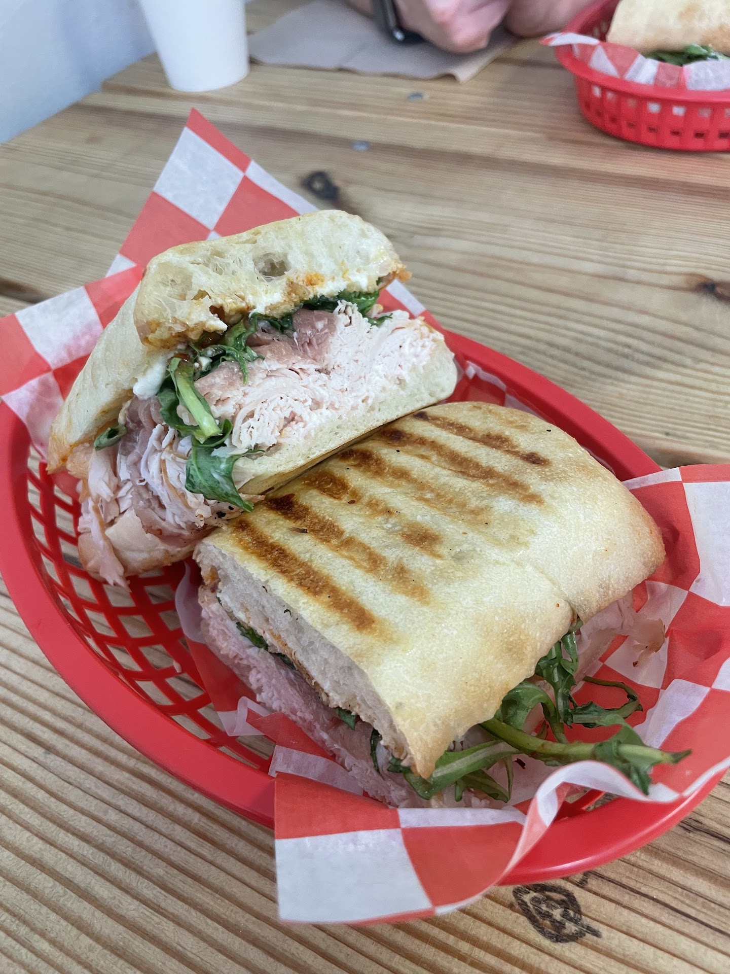 wait time was very short considering it was right at lunch time, however it came in a to-go bag and wrapped. but that wasnât a big deal. the sandwich tasted good, but it was a bit difficult to discern all the flavours and the spicyness from the chilli crunch wasnât too hot sadly. i did add some extra hot honey that they have available on the table that spruced it all up a bit.