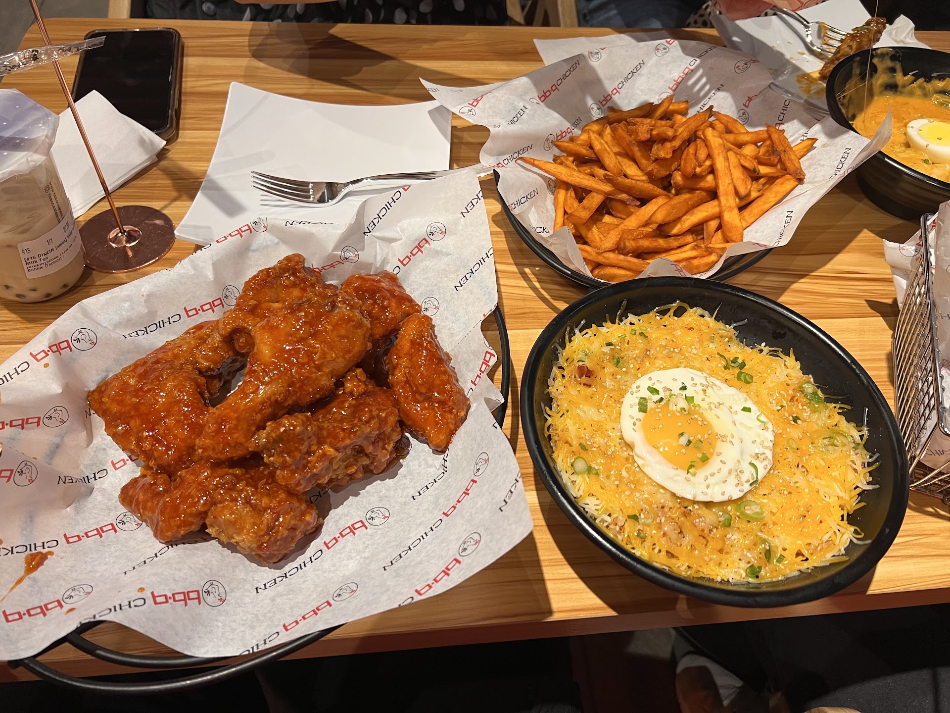 Read moreVery good but not better than Crisp. If you enjoy a panko-like crunch (meaning extra batter), than you will love it. However, I find that Crisp (another Korean Fried Chicken joint, albeit a locally owned shop, not a chain) has a lighter coating while maintaining the crunch and juiciness which makes it the winner in my book. The wings are bigger too. Comparisons aside, it is a solid fried chicken with some good sauces (sweet soy garlic, Gangnam style) and questionable ones (Galbi has an off-taste which is supposed to be a “off the grill taste” emits a plastic-chemical nuance). I wish you could get any of the sauces on the side or at least try them first. On the next visit will be the cheesy; it looks fantastic. Sweet potato fries are done to perfection, if the packaged side of marinara it comes with throws one off (no ketchup?). Needs a good dry seasoning. Crew is helpful and friendly. You can also order boba from next door with...