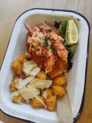 We ordered two lobster rolls one with bleu cheese tator tots and the other with Parmesan cheese tator tots. The lobster was served cold but the bun was slightly warm and buttery, toasted and flavorful. The lobster itself could have used more flavor/butter. But overall I enjoyed it. The tator tots were mid nothing special I would have preferred fries.