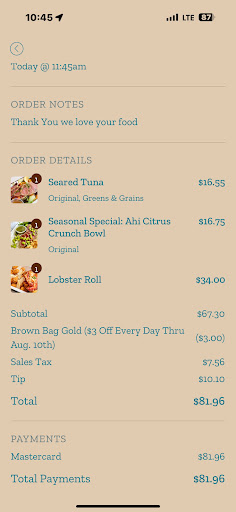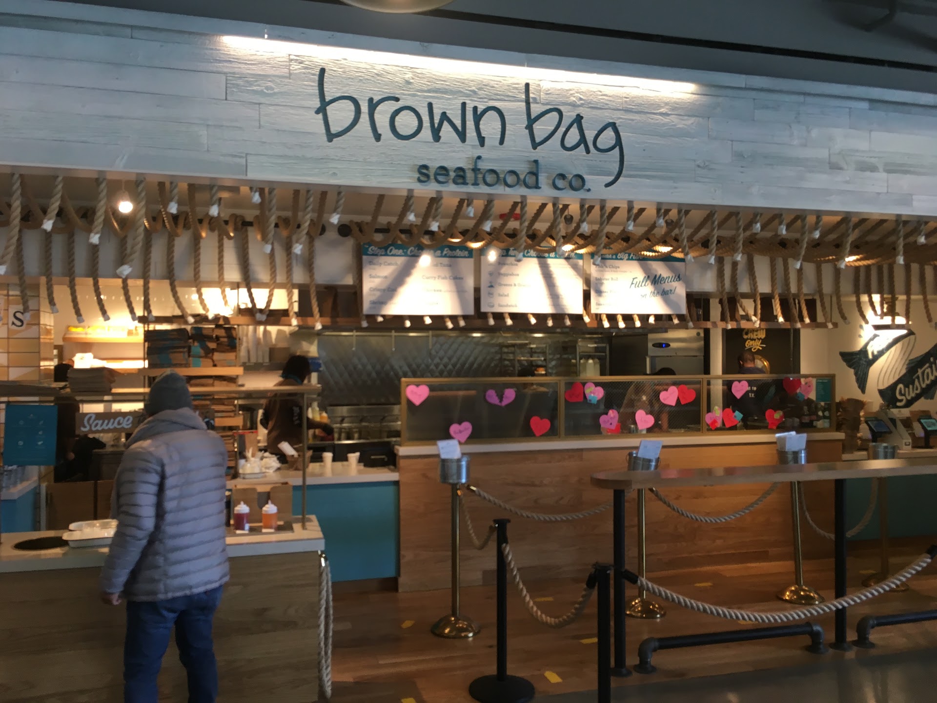 Read moreI love Brown Bag Seafood but prices are a bit inflated on food apps. That being said, I jumped at the chance to grab some while downtown taking care of some business. The atmosphere is definitely buzzing due to the lunch hour so the line was a bit long but moved fast. I ordered the honey sriracha salmon dinner plate with greens and grains and some hush puppies.