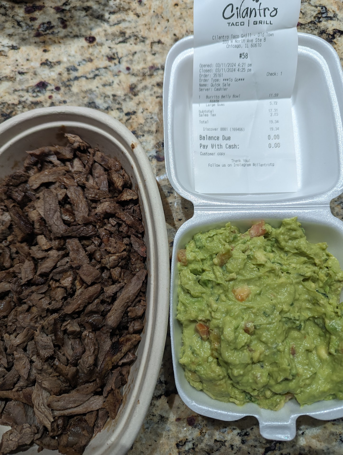 I've been a regular at Cilantro Taco Grill in Old Town, especially drawn to their irresistible guacamole. On my latest visit, the aroma of grilling carne asada tantalized me enough to try something new alongside my usual guacamole order. Opting for just the carne asada in a bowl, I anticipated a small variation in price considering my simple choice. To my surprise, I was charged the full price of a bowl, rounding up my total to $19.34.