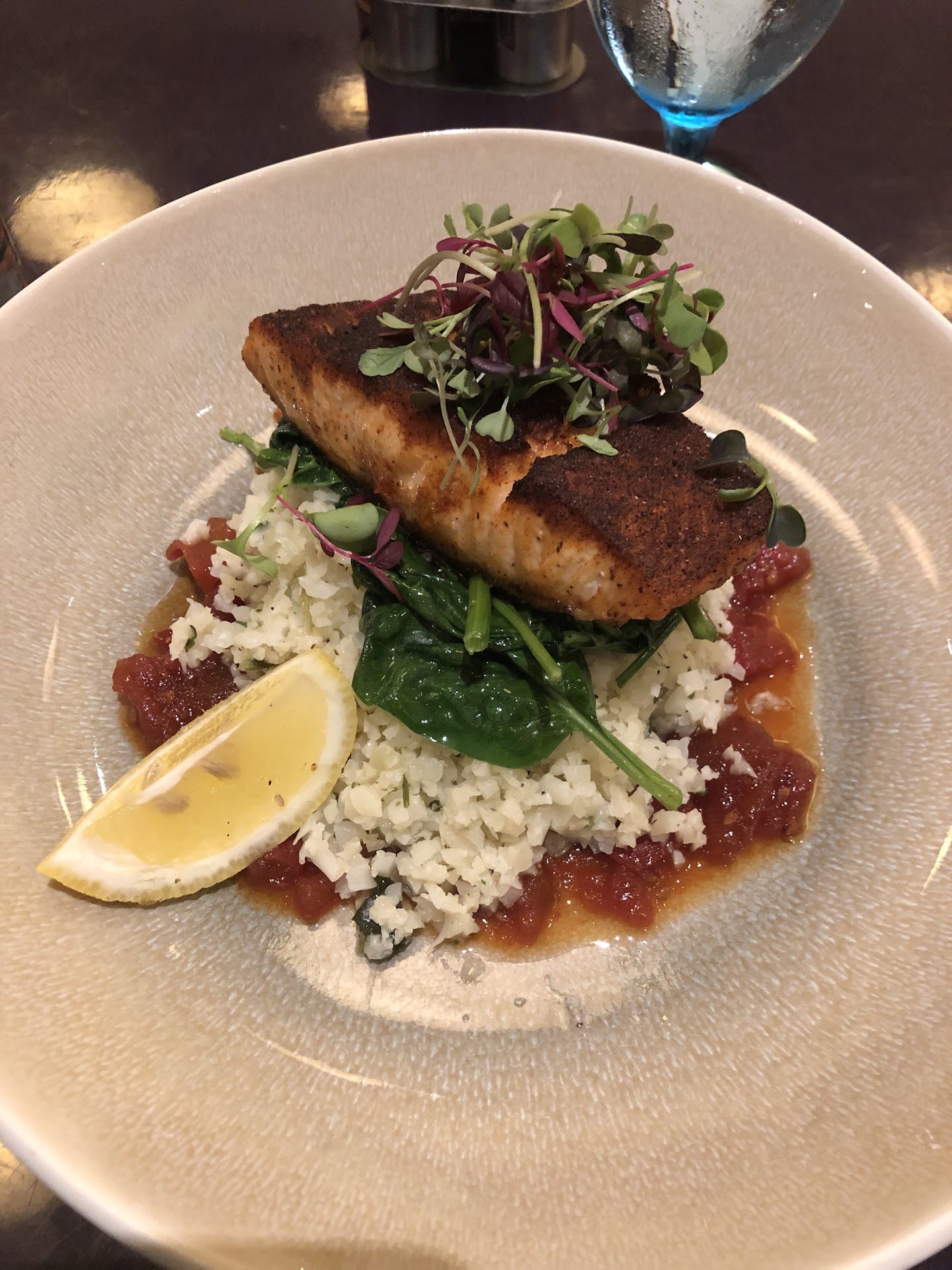 This restaurant is part of the W hotel. I was only staying there one night, but I wanted to take myself out to dinner solo. The first drink, the Sweet Rose and the entrée the Blackened Salmon were delicious! Both items had great flavor profiles and we’re really tasty. The problem came at dessert, initially I wanted the chocolate cake. However, it took service staff 15 minutes to tell me that they were out of chocolate cake upon making another selection that donuts that took an additional 30 minutes to arrive. It was obvious that other orders, particularly those on the patio to the priority. When dessert finally arrived at 10:15 PM rather than receiving the blueberry compote, it came with plain white icing, as well as the other two dipping sauces, caramel and chocolate. It also came with five regular size cake donuts, dusted with powdered sugar which which is too much for one person. In general, the dish was too sweet, and the flavors just weren’t there just sugar. Two of the donuts were also slightly burnt, I assume with the kitchen trying to finish out orders. If the restaurant has the opportunity to make changes to this dish, I would swap the cake donuts for a yeast donut or beignet. And for your sauces, do a raspberry jam, a salted caramel, and a chocolate mousse with the powdered sugar on the side. I also wanted to pair the desert with another drink, so I got the Gold Rush but that was just bitter and sour in a bad way and again needed something to break up the flavor, like mint or time or basil. Though , the tail end of my meal didn’t end well, the wait staff were nice and super apologetic, and even gave me a discount for the super long wait on the dessert.