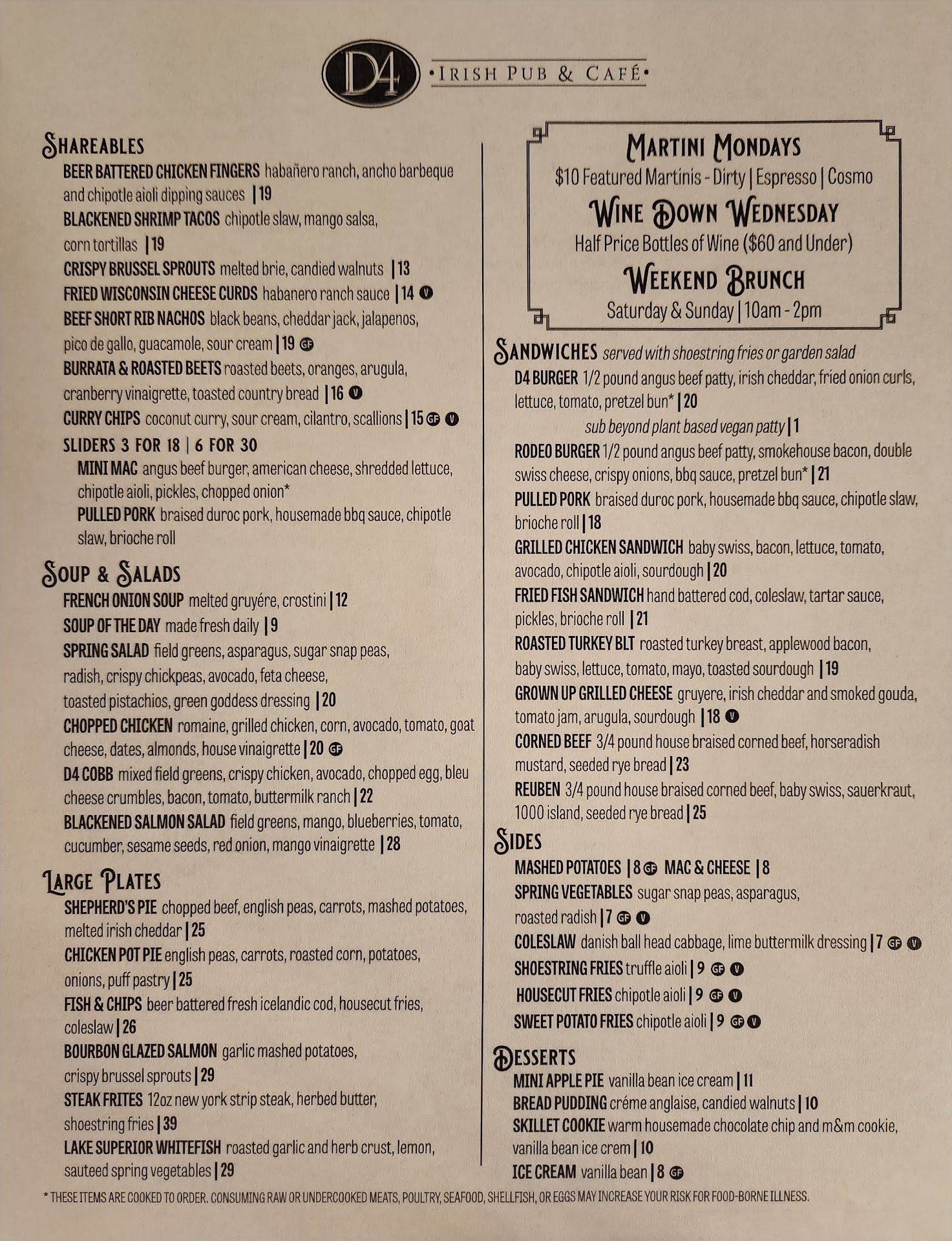 Read morePunished for having a high tolerance. I started going to D4 when I moved into the area about 4 months ago. I found the staff friendly and thought the food was good. But today, I experienced something I've never experienced before in my whole adult life of drinking at bars. I was not allowed my last drink at last call. The bartender who I had even become friendly with said "at their discretion" they felt my last drink would be overserving. I was drinking prosecco, not hard liquor. And I wasn't exhibiting signs of intoxication, let alone tipsyness, yet they cut me off. I'm actually writing this after leaving there. I wonder if they'll do the same for the super drunk people who will most definitely be there next week for St. Paddy's. If I were slurring my words and incoherent, that would make sense. But to just decide by amount... that I haven't heard of. I have a high tolerance to hard alcohol so my tolerance to wine, which is on average 13% abv, is even higher. I've only seen this happen to people who have clearly had enough. I even let them know I wouldn't return if they were going to go this route cause I could've just bought myself a bottle of the same prosecco for much less and drank it at home. They still denied me the last glass of prosecco. It's unfortunate cause I've seen the same person serve obviously drunk people before: a drunk guy that even harassed me one night at this bar. They claim they were looking out for me, but I feel like they may have had to open a new bottle and didn't want to at the end of the night. If they had told me that instead, I would've understood, and they would've avoided losing me as a regular customer. Since I was drinking by the glass, the cost of how many glasses I had already exceeded the cost of a full bottle by a little over $20. Yet, I had not even had enough glasses to equal a bottle. I was happily patronizing a local business over drinking at home and saving a bunch of money. So, the attempt to gaslight me into thinking I'm drunk has left me incredibly disappointed, embarrassed, and a little hurt. I sadly won't be returning nor ordering takeout anymore. I hope that the bartender learns...