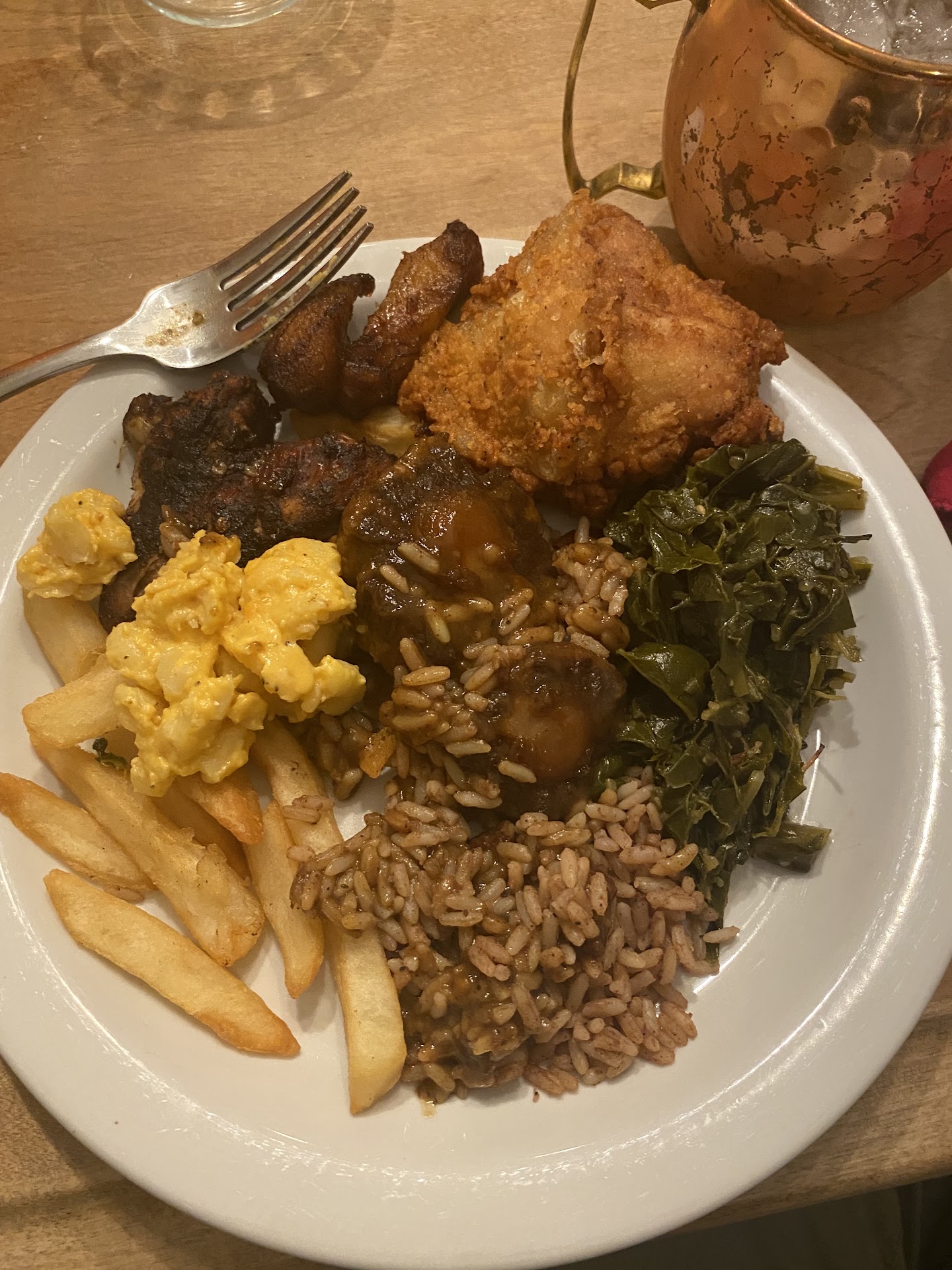 The cabbage had great depth of flavor thanks to the seasonings and smoked meat, and the yams were rich and had a really smooth texture. Unfortunately, the wings didn’t quite hit the mark for me. I love spicy food, but the heat overpowered any traditional, smoked jerk flavor I was hoping for as the chicken itself lacked seasoning beyond the sauce.