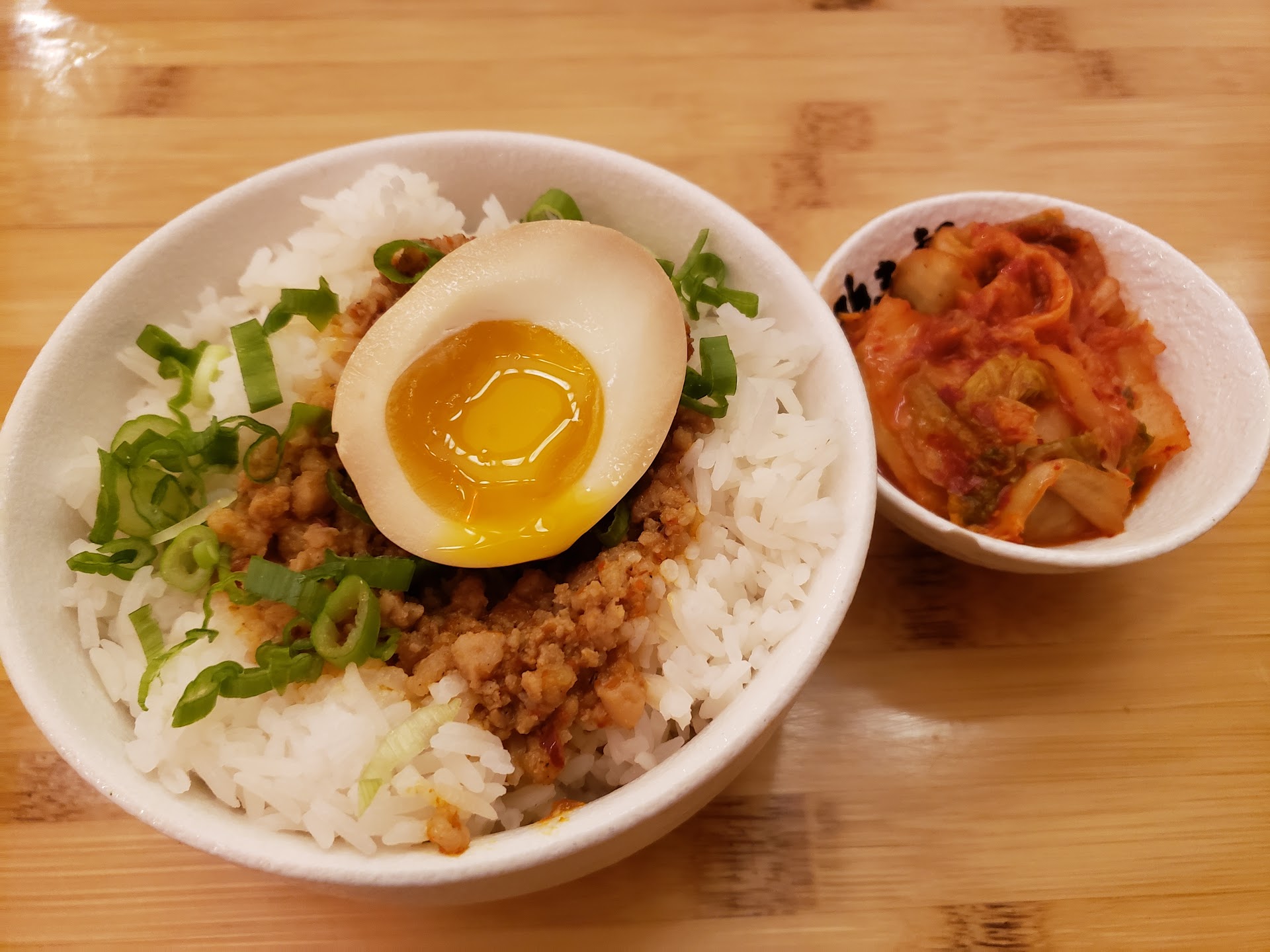 For $8.99, this was basically a bowl of rice, with maybe a tablespoon of ground pork, sauce, green onions, plus half soft boiled egg. Also added a side of kimchi for a dollar. This was not what I expected. I would not order this again. Basically ate a bowl of rice for dinner with kimchi. The pork had no flavor and not even visible in this dish. 😢