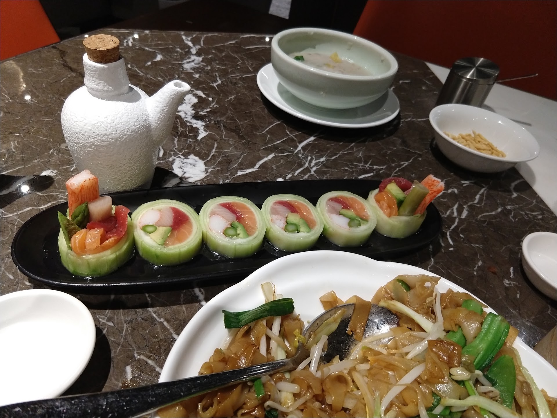The experience overall at best was just visually appealing. My wife and I went there to get some sushi as Google images shows some delicous looking sushi. Upon entering the restaruant, it looked and had the feel of a high end restaurant. It looked like we were going to enjoy our lunch. The waiter took us to our seats. Tables and seating looked great. Very high end and contemporary. The waiter handed us each a tablet with the menu on it. Keeping up with the modern tech, nice touch. Upon first glance on the menu, there was no sushi menu so I asked about it. They said theres no sushi... thats when everything started going downhill. We were disappointed and it turned out it probably was a menu item back then but not now. Anyways, not the end of the world. We looked through the menu and there were quite a lot of options but I opted for fried rice and pork dumplings whereas my wife went with a stir fried noodle dish and a soup. Staff was very friendly and quick to refill while we waited for our dishes. They first delivered the dumplings. There was a funky smell to it. The taste was fine... nothing amazing. Next was the soup. Again, nothing amazing, bland. We finished and then they delivered our main dishes. Upon first impression of the fried rice, the rice was literally sitting in a pool of sauce. Texture was super soggy and rice was mushy. Taste wasn't bold or anything, not like how you picture the taste of fried rice... felt like they just poured too much sauce over some rice. If you close your eyes and look for the taste... you can sense it but it's not any special. We were pretty disappointed in the fried rice so we moved onto the fried noodles hoping to fill our appetite and have the restaurant redeem itself. Upon eating the first bite, we tasted absolutely nothing... it was spicy but thats about it... you'd probably find more joy eating a jalapeño. Took a chunck of the beef bits in the noodles... again, nothing... We barely touched the food and our appetite was pretty much gone at this point and asked for our checks. We departed with a gift of regular cookies and fortune cookies. My wife took one bite from the cookie hoping to clense her pallete with some sweets... CRUNCH... hard cookie.... no taste... dry... we left with an appetite unsatisfied and lots of money lost. The restaurant's staff were amazing, nice, and very friendly. The place is very well kepted and it really felt good to sit in there. Unfortunately the food did not deliver. Fried rice and fried noodles are a basic Chinese cuisine in which all Chinese restaurants should know how to cook up at minimum to be considered a chinese restaurant. They had a huge menu of deliciously looking dishes but unfortunately, fail to master any one of them. Unfortunately, it was the fortune cookie that we left with that tasted the best. If you're looking to hang out and and chill with some friends, this place is not bad. But if you're looking for good food, I recommend you...