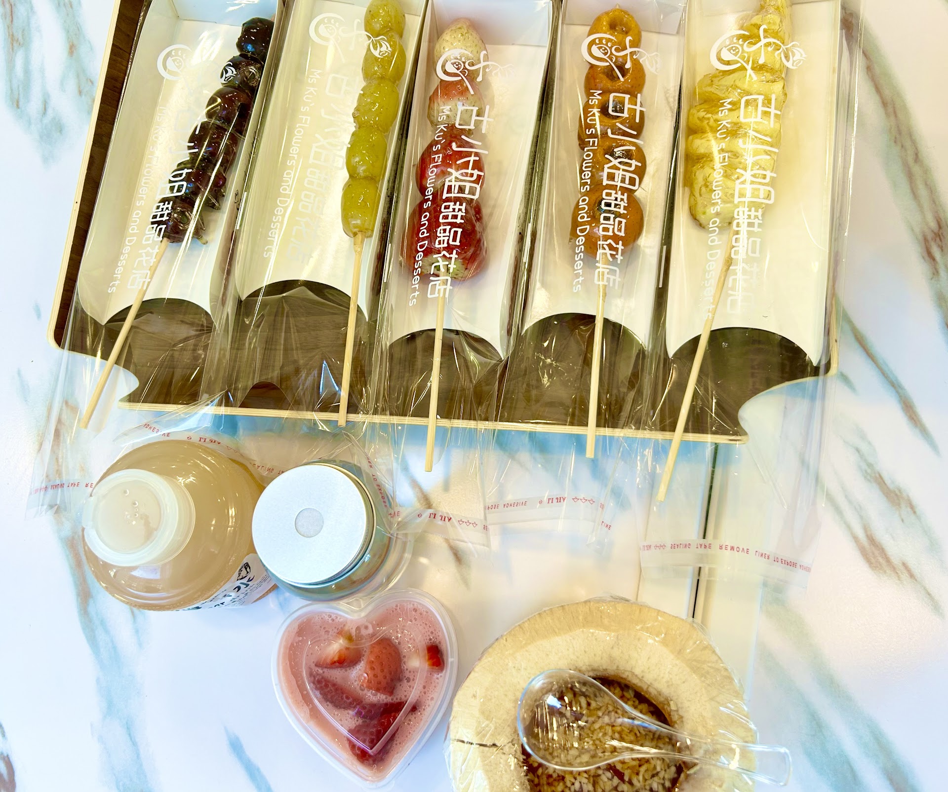 My friends and I had initially gone in to get some tang Hulu and thought the place was really cute. However, we sat for forty minutes without any acknowledgment from staff after placing our order. After we started to visibly get upset, the staff approached us to notify us there had been an issue with the sugar and we would have to wait an additional twenty minutes for our order. They had some other options prepared and we opted to get those instead to avoid the wait. Once we were in the car and finally took the first bites, the sugar was burnt and the whole thing tasted horrible. To pay $30 for three fruit skewers is already a bit much but to give us an inedible product after we waited for that long was simply...
