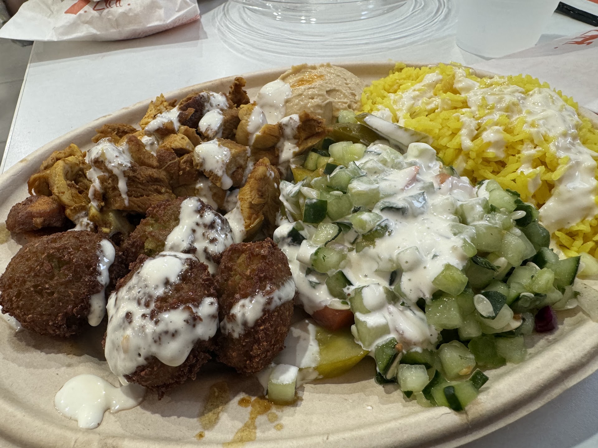 I ended up getting a chicken bowl (FYI the bowls come with a side of pita) with basmati rice and all the veggies finished with tahini sauce, garlic sauce, and the harissa sauce for a kick.