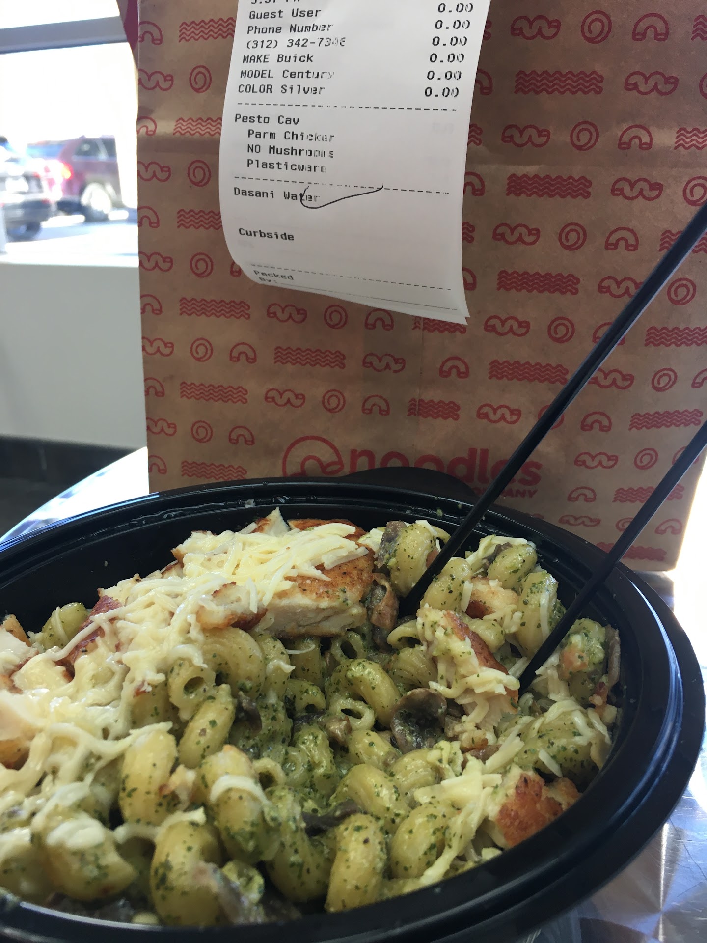The photo attached is of my meal. I order the pesto cavatappi with parmesan chicken, no mushrooms. In the background, you can see the âNO mushroomâ on the receipt, while you can clearly see mushrooms in the bowl. You can also see the coffee stirrers Iâm using as impromptu chopsticks, next to the note that says...
