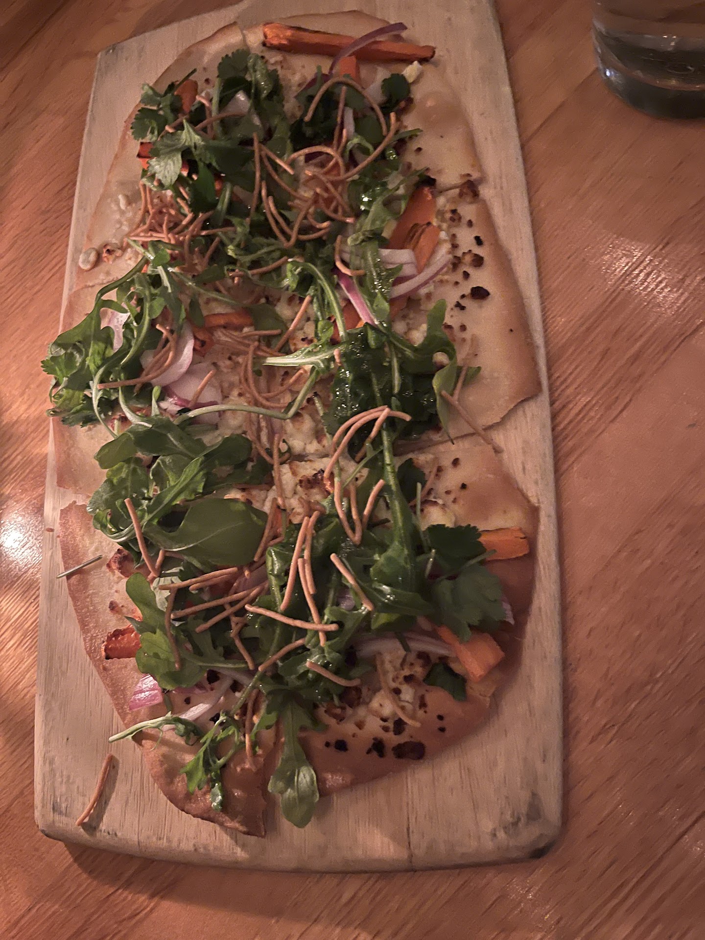Stopped in for dinner with two friends. Starter: Fried green beans w/ masala aioli - fantastic coating and the aioli was great. Buffalo butter cauliflower - Great buffalo wing flavor, but completely vegetarian. Delicious. Bruschetta - The burrata cheese was great, but the rest kind of tasted jumbled together. Not bad, but not as impressive as the other two