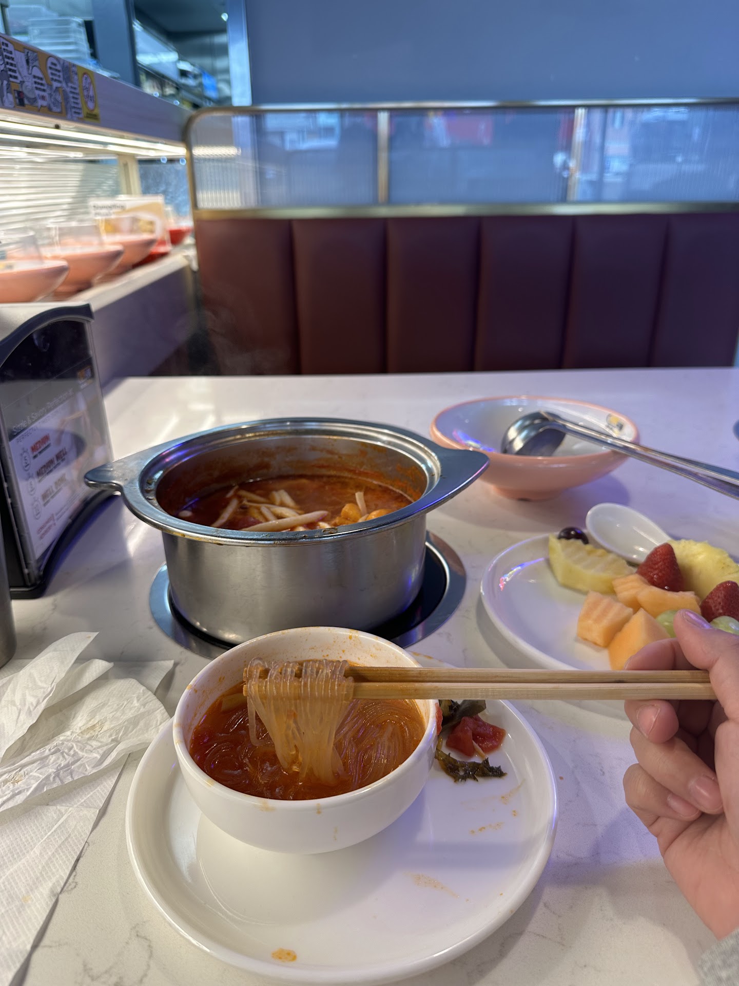 The DIY sauce bar is another highlight. You can create your own perfect dipping sauce with garlic, sesame paste, scallions, cilantro, chili oil, and more. Plus, they even have fresh fruit like pineapple, strawberries, and melon—super refreshing after a hot meal.