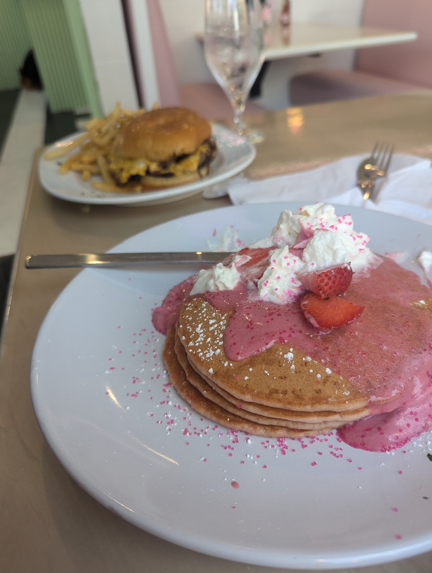 I went for the strawberry short stack since it seemed to match the vibe of the space (and was featured on the poster outside). My partner went for the Burger Burger with a side salad. They accidentally swapped his side and brought out the salad, offering the fries on the house since it was their mix-up.