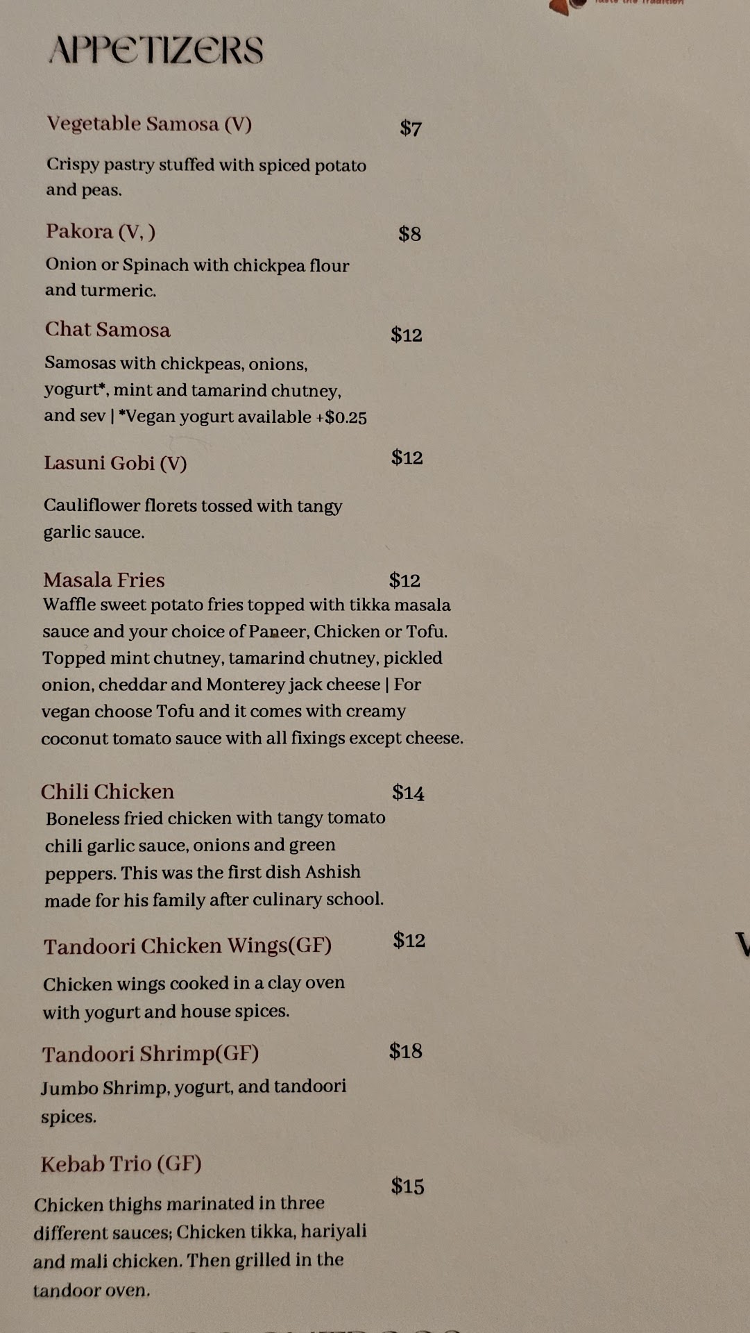 Prices are about $18-25 per person depending on if you do an appetizer. Your bill for 2 people will probably run you around 50 dollars, though for us it goes a little higher because we're always ordering extras. The meat you choose will also impact your final price. This said, it's absolutely worth the price. The food is extremely well made, and for those of you who yearn for a taste of India, I recommend this without question.