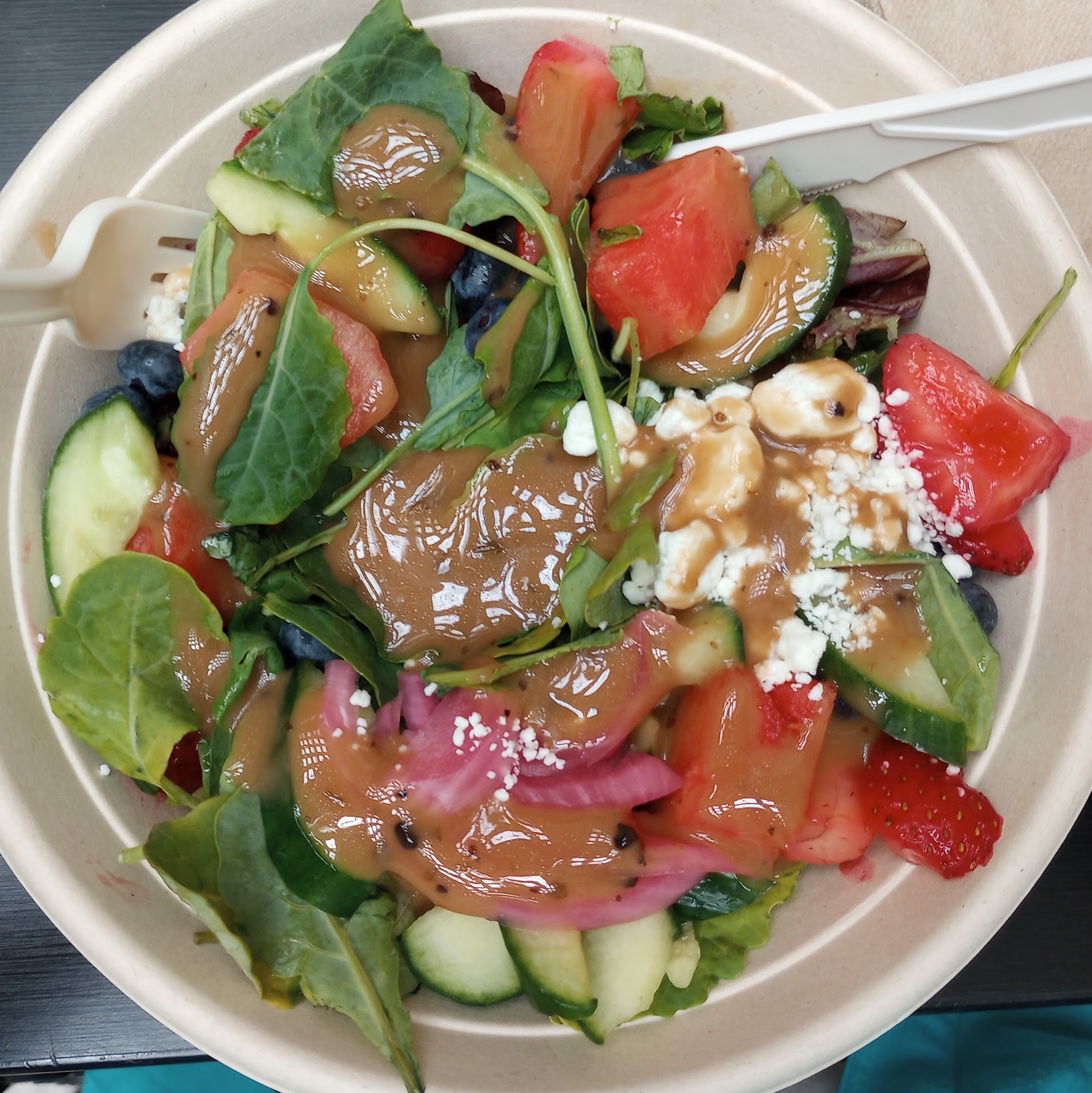 Instead, we arrive and they don't offer ANY of the salads advertised on the website. We had to settle for two Summer Berry and Watermelon salads (with a little feta cheese) for $15 each and add a grilled cheese that we split (for $8). So instead of $28, our meal cost $38 and didn't provide the full protein we expected.